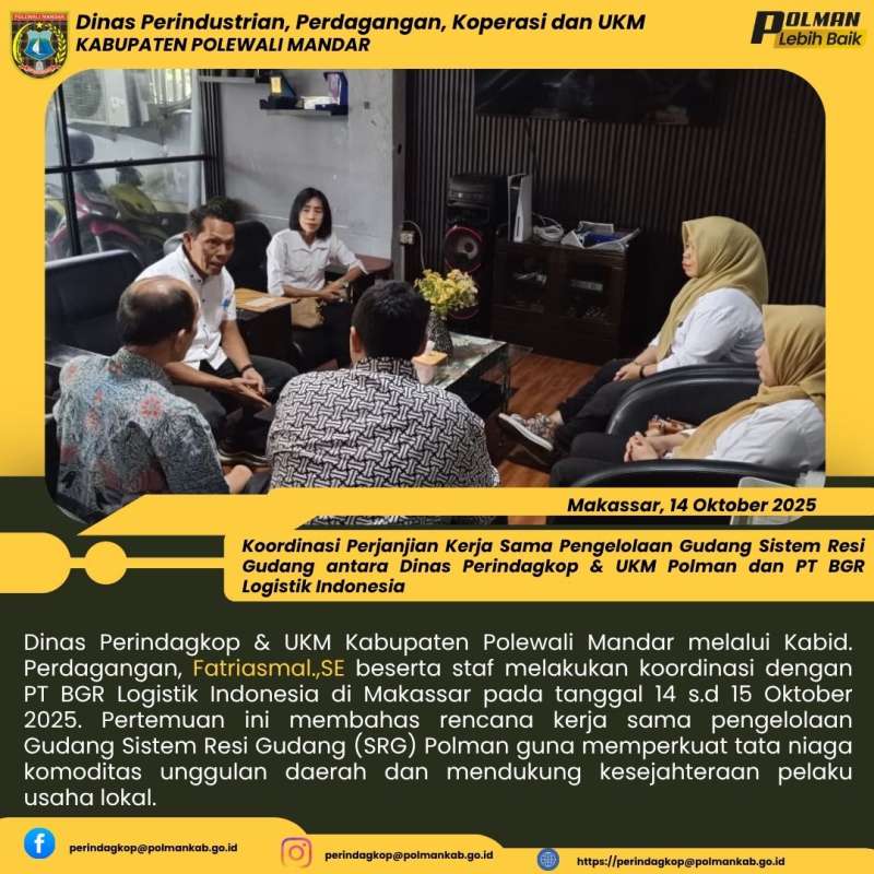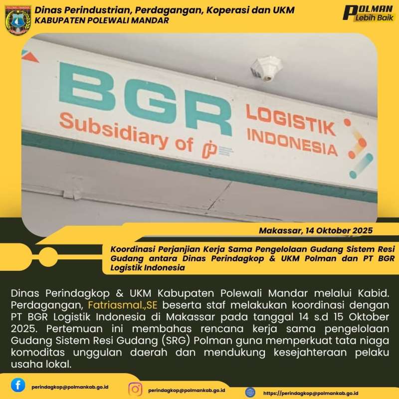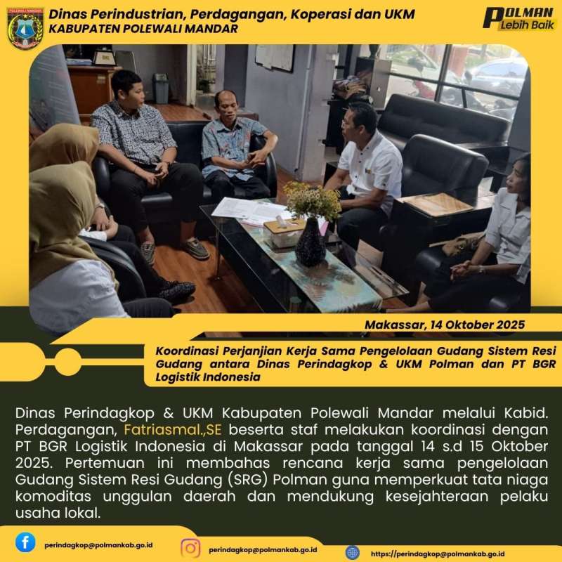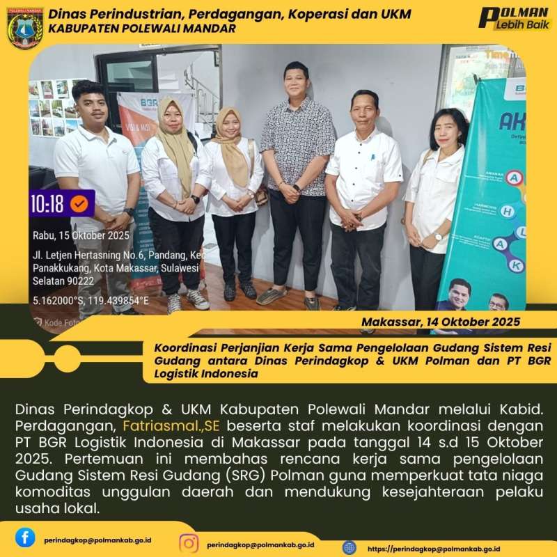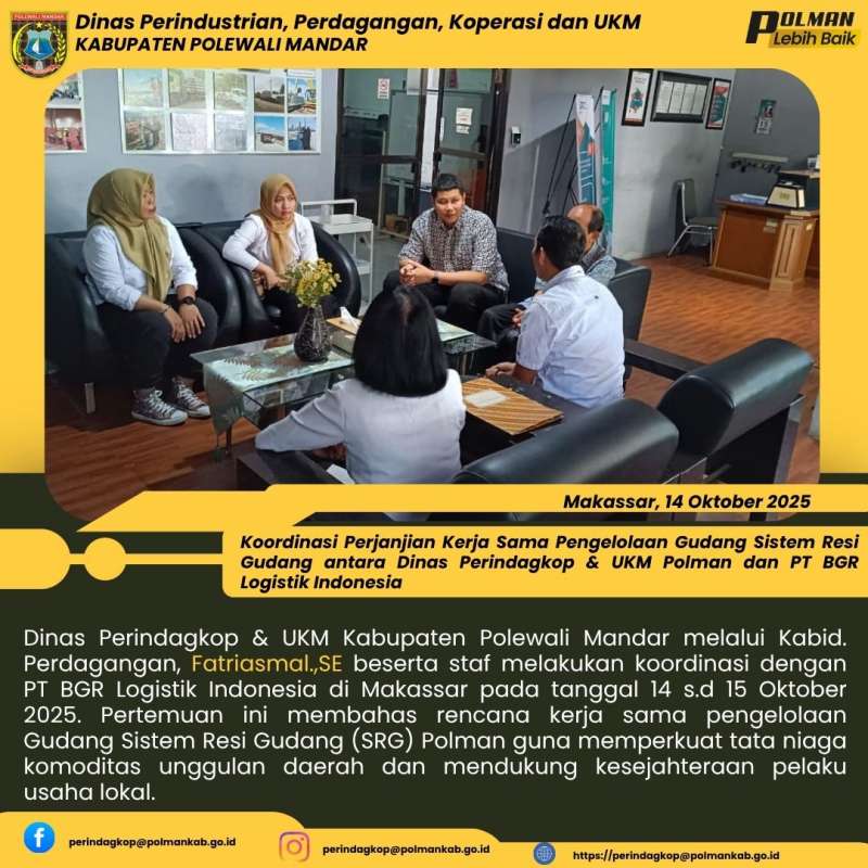 Dinas Perindagkop & UKM Kabupaten Polewali Mandar melalui Kabid. Perdagangan, Fatriasmal.,SE beserta staf melakukan koordinasi dengan PT BGR Logistik Indonesia di Makassar pada tanggal 14 s.d 15 Oktober 2025. Pertemuan ini membahas rencana kerja sama pengelolaan Gudang Sistem Resi Gudang (SRG) Polman guna memperkuat tata niaga komoditas unggulan daerah dan mendukung kesejahteraan pelaku usaha lokal.