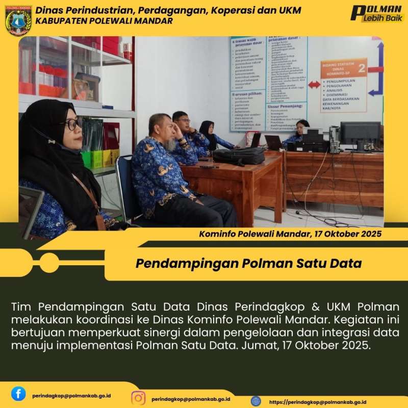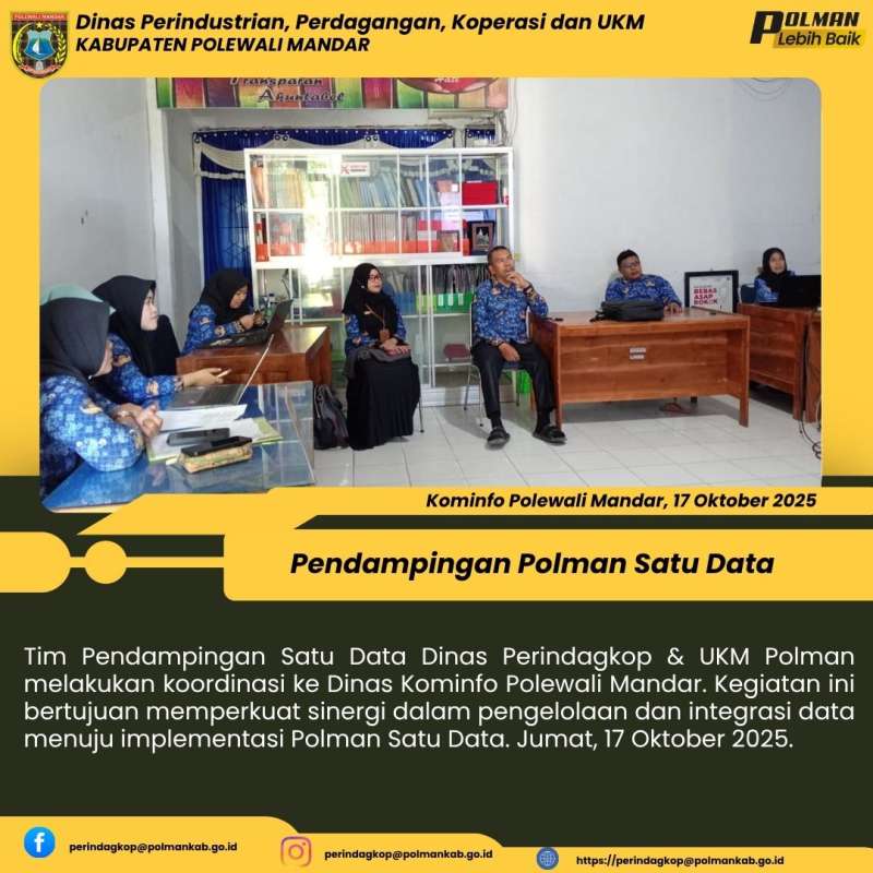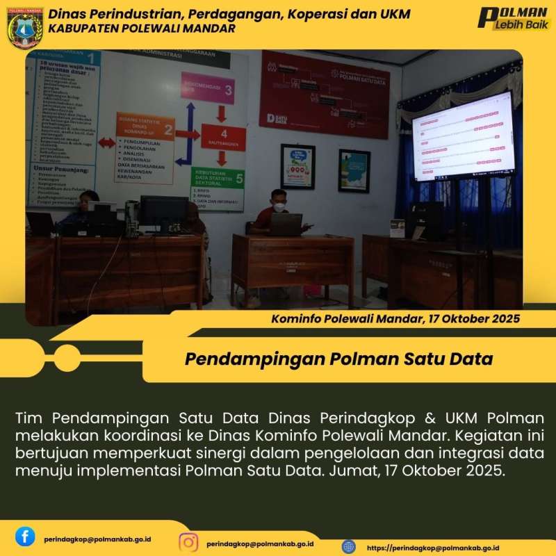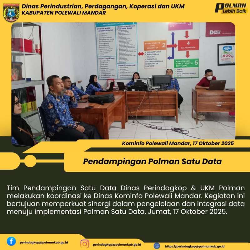 Tim Pendampingan Satu Data Dinas Perindagkop & UKM Polman melakukan koordinasi ke Dinas Kominfo Polewali Mandar. Kegiatan ini bertujuan memperkuat sinergi dalam pengelolaan dan integrasi data menuju implementasi Polman Satu Data. Jumat, 17 Oktober 2025.