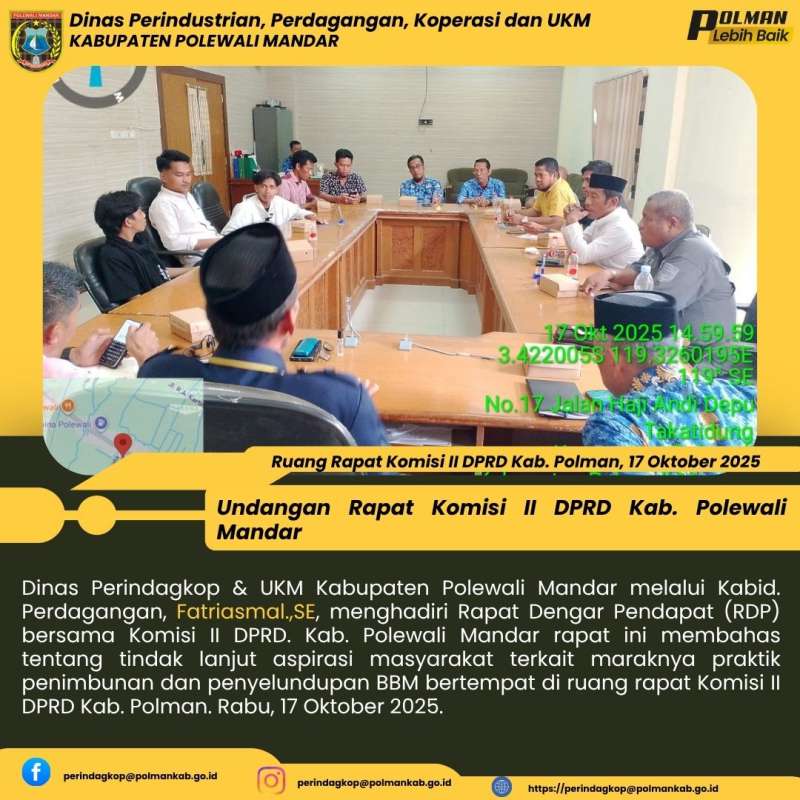 Dinas Perindagkop & UKM Kabupaten Polewali Mandar melalui Kabid. Perdagangan, Fatriasmal.,SE, menghadiri Rapat Dengar Pendapat (RDP) bersama Komisi II DPRD. Kab. Polewali Mandar rapat ini membahas tentang tindak lanjut aspirasi masyarakat terkait maraknya praktik penimbunan dan penyelundupan BBM bertempat di ruang rapat Komisi II DPRD Kab. Polman. Rabu, 17 Oktober 2025.