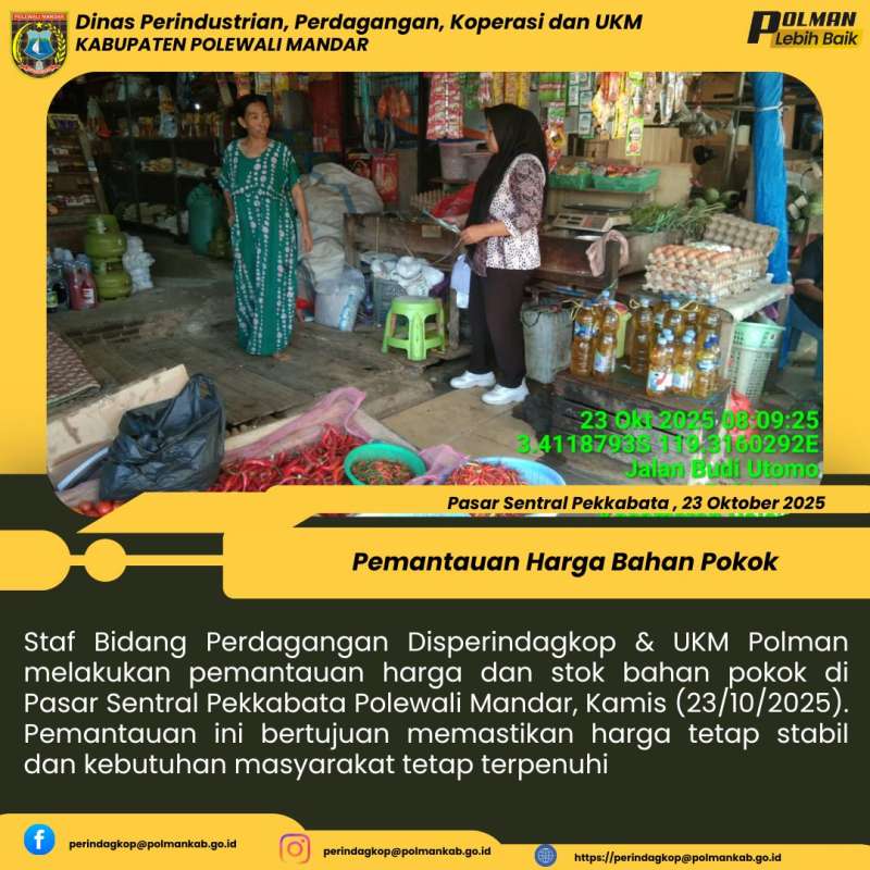 Staf Bidang Perdagangan Disperindagkop & UKM Polman melakukan pemantauan harga dan stok bahan pokok di Pasar Sentral Pekkabata Polewali Mandar, Kamis (23/10/2025). Pemantauan ini bertujuan memastikan harga tetap stabil dan kebutuhan masyarakat tetap terpenuhi