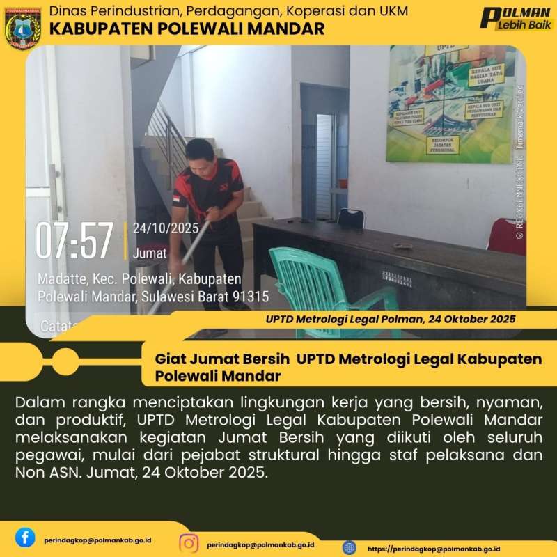 Dalam rangka menciptakan lingkungan kerja yang bersih, nyaman, dan produktif, UPTD Metrologi Legal Kabupaten Polewali Mandar melaksanakan kegiatan Jumat Bersih yang diikuti oleh seluruh pegawai, mulai dari pejabat struktural hingga staf pelaksana dan Non ASN. Jumat, 24 Oktober 2025.
