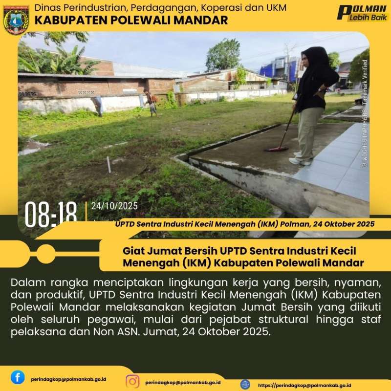 Dalam rangka menciptakan lingkungan kerja yang bersih, nyaman, dan produktif, UPTD Sentra Industri Kecil Menengah (IKM) Kabupaten Polewali Mandar melaksanakan kegiatan Jumat Bersih yang diikuti oleh seluruh pegawai, mulai dari pejabat struktural hingga staf pelaksana dan Non ASN. Jumat, 24 Oktober 2025.'