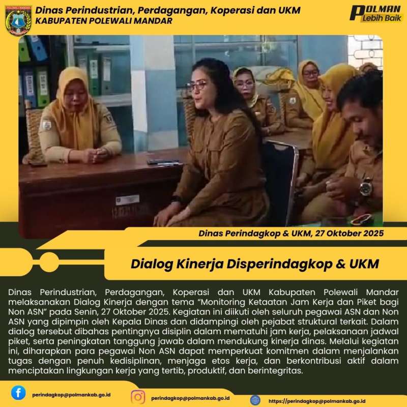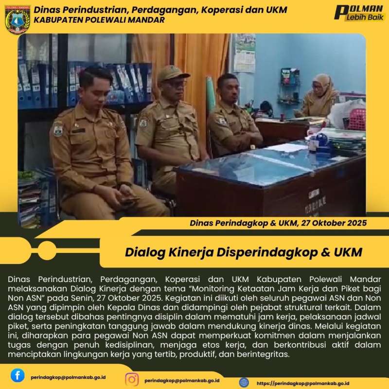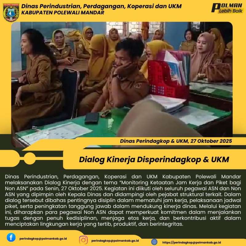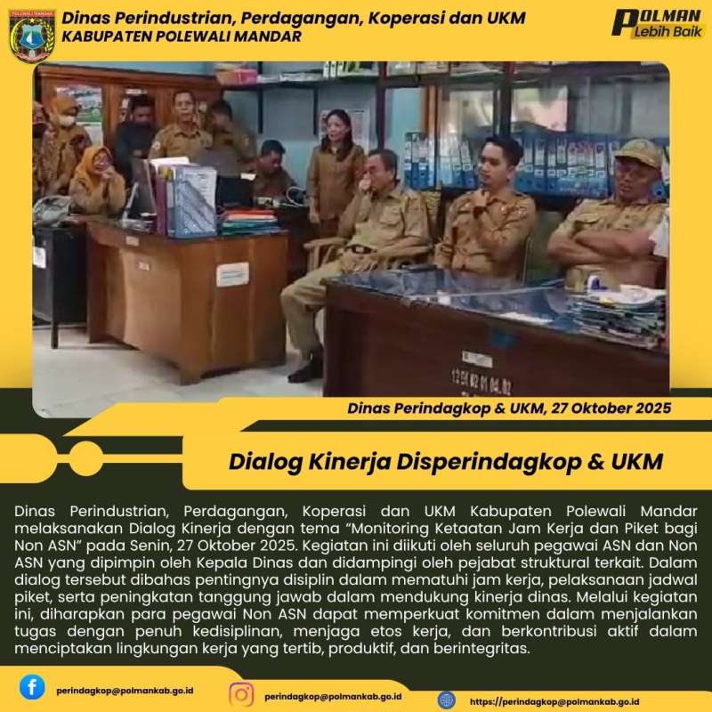 Dinas Perindustrian, Perdagangan, Koperasi dan UKM Kabupaten Polewali Mandar melaksanakan Dialog Kinerja dengan tema “Monitoring Ketaatan Jam Kerja dan Piket bagi Non ASN” pada Senin, 27 Oktober 2025. Kegiatan ini diikuti oleh seluruh pegawai ASN dan Non ASN yang dipimpin oleh Kepala Dinas dan didampingi oleh pejabat struktural terkait. Dalam dialog tersebut dibahas pentingnya disiplin dalam mematuhi jam kerja, pelaksanaan jadwal piket, serta peningkatan tanggung jawab dalam mendukung kinerja dinas. Melalui kegiatan ini, diharapkan para pegawai Non ASN dapat memperkuat komitmen dalam menjalankan tugas dengan penuh kedisiplinan, menjaga etos kerja, dan berkontribusi aktif dalam menciptakan lingkungan kerja yang tertib, produktif, dan berintegritas.