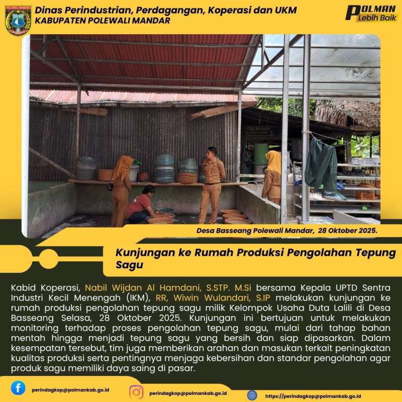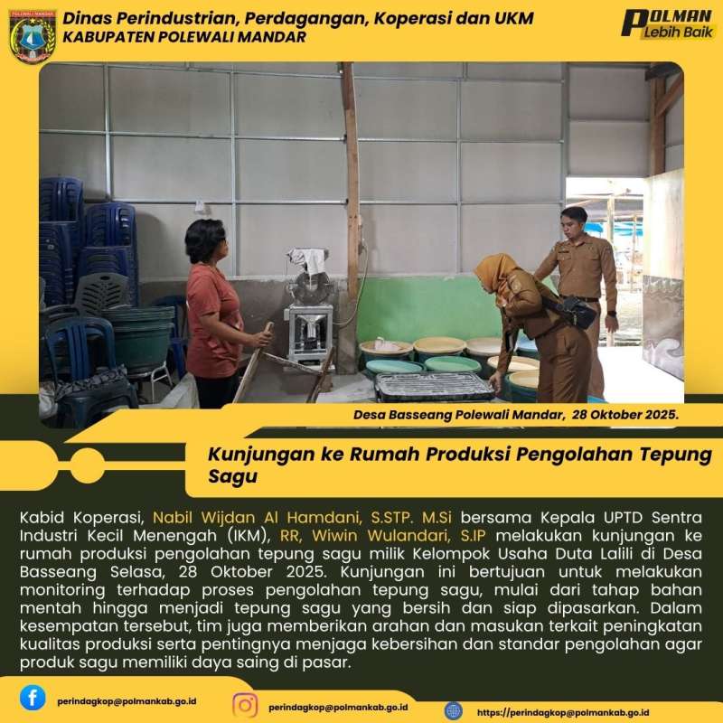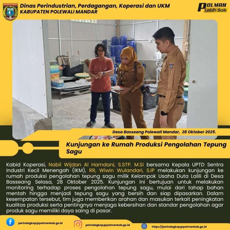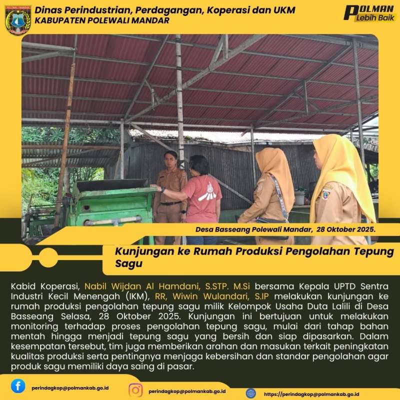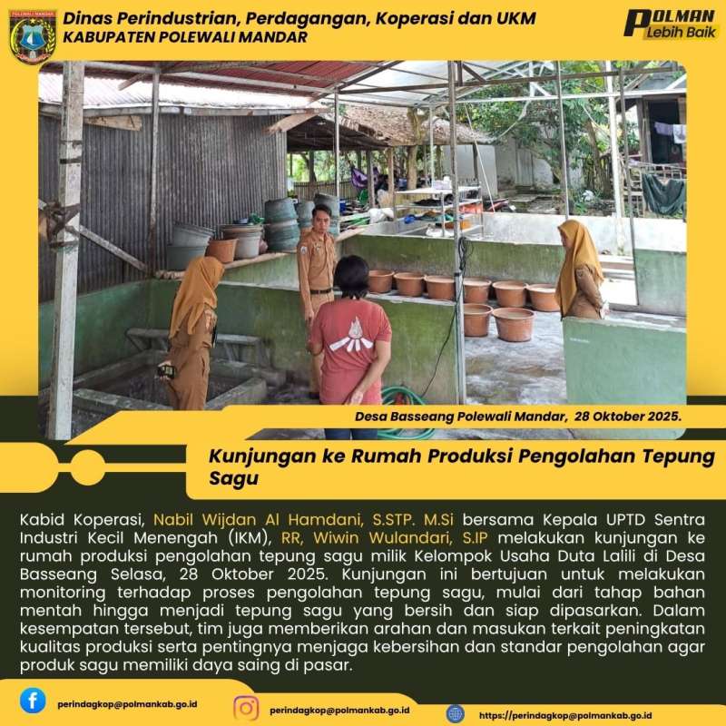 Kabid Koperasi, Nabil Wijdan Al Hamdani, S.STP. M.Si bersama Kepala UPTD Sentra Industri Kecil Menengah (IKM), RR, Wiwin Wulandari, S.IP melakukan kunjungan ke rumah produksi pengolahan tepung sagu milik Kelompok Usaha Duta Lalili di Desa Basseang Selasa, 28 Oktober 2025. Kunjungan ini bertujuan untuk melakukan monitoring terhadap proses pengolahan tepung sagu, mulai dari tahap bahan mentah hingga menjadi tepung sagu yang bersih dan siap dipasarkan. Dalam kesempatan tersebut, tim juga memberikan arahan dan masukan terkait peningkatan kualitas produksi serta pentingnya menjaga kebersihan dan standar pengolahan agar produk sagu memiliki daya saing di pasar.
