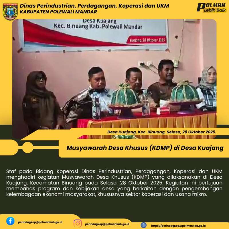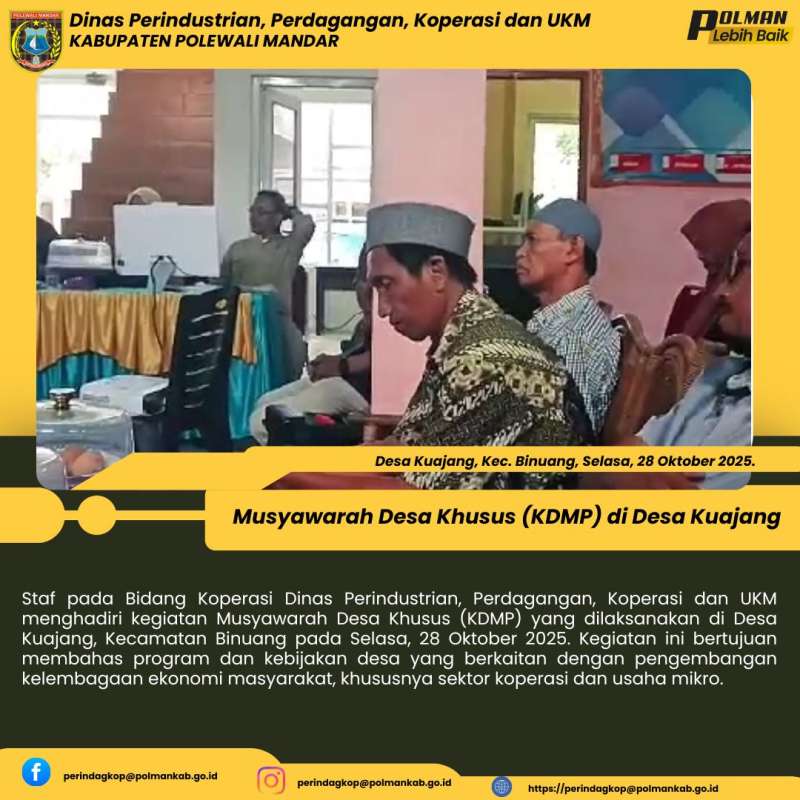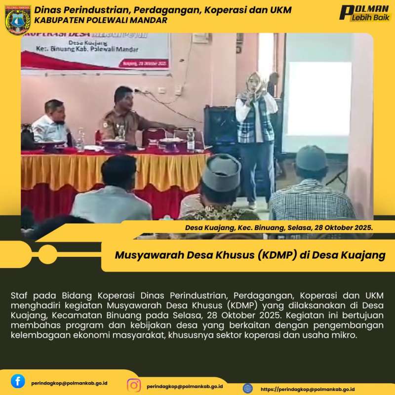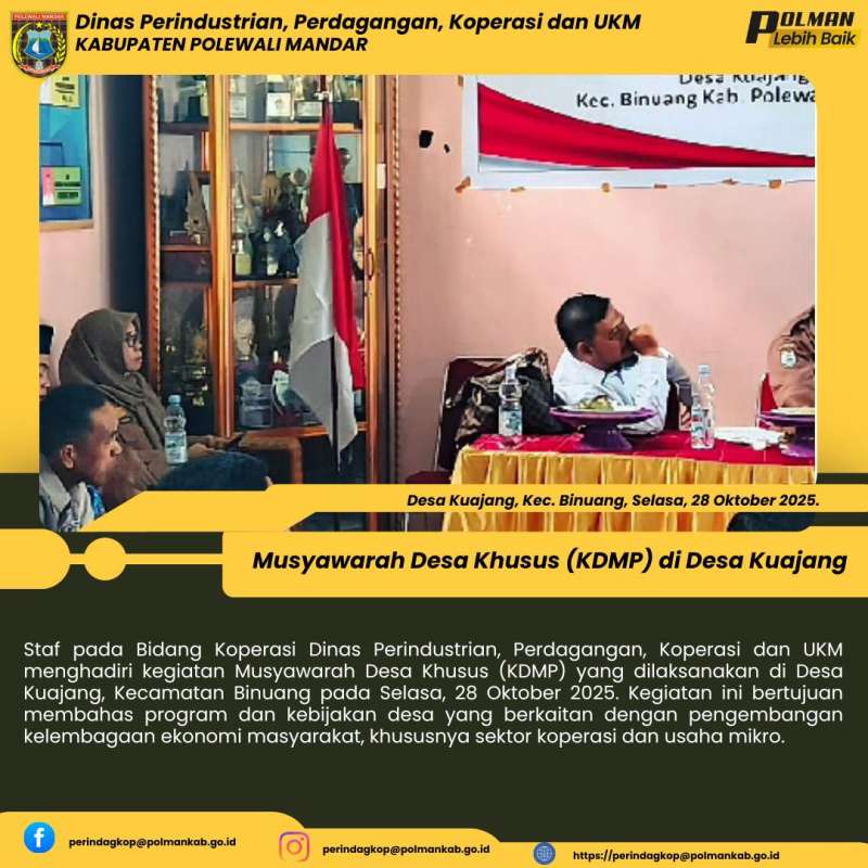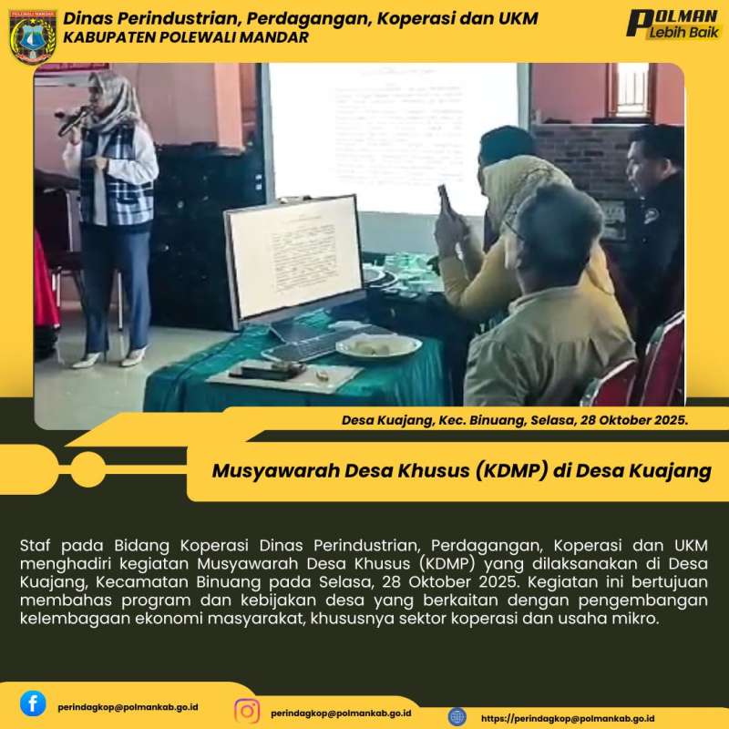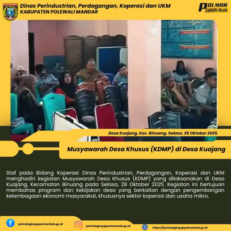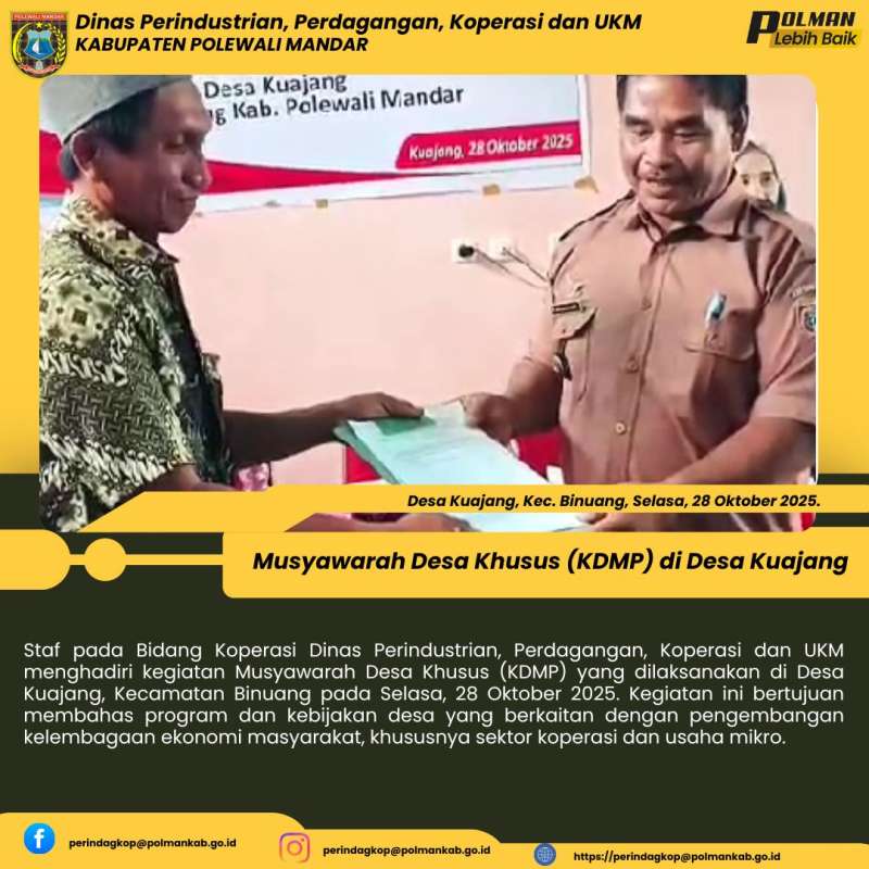 Staf pada Bidang Koperasi Dinas Perindustrian, Perdagangan, Koperasi dan UKM menghadiri kegiatan Musyawarah Desa Khusus (KDMP) yang dilaksanakan di Desa Kuajang, Kecamatan Binuang pada Selasa, 28 Oktober 2025. Kegiatan ini bertujuan membahas program dan kebijakan desa yang berkaitan dengan pengembangan kelembagaan ekonomi masyarakat, khususnya sektor koperasi dan usaha mikro.