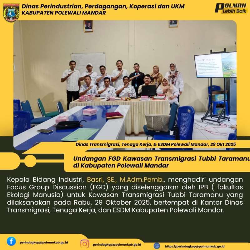 Kepala Bidang Industri, Basri, SE., M.Adm.Pemb., menghadiri undangan Focus Group Discussion (FGD) yang diselenggaran oleh IPB ( fakultas Ekologi Manusia) untuk Kawasan Transmigrasi Tubbi Taramanu yang dilaksanakan pada Rabu, 29 Oktober 2025, bertempat di Kantor Dinas Transmigrasi, Tenaga Kerja, dan ESDM Kabupaten Polewali Mandar.