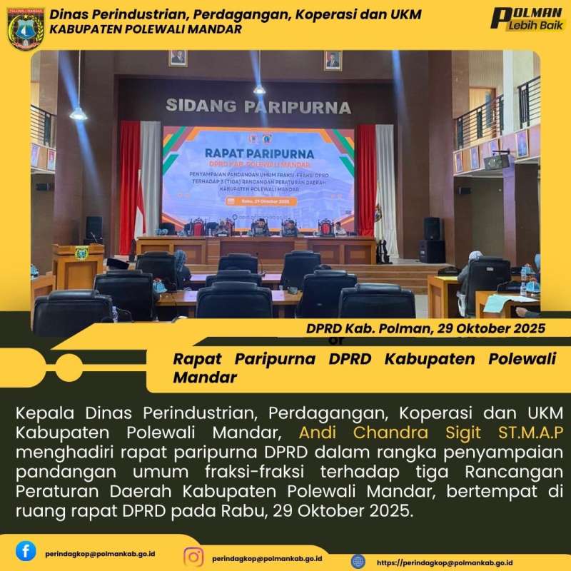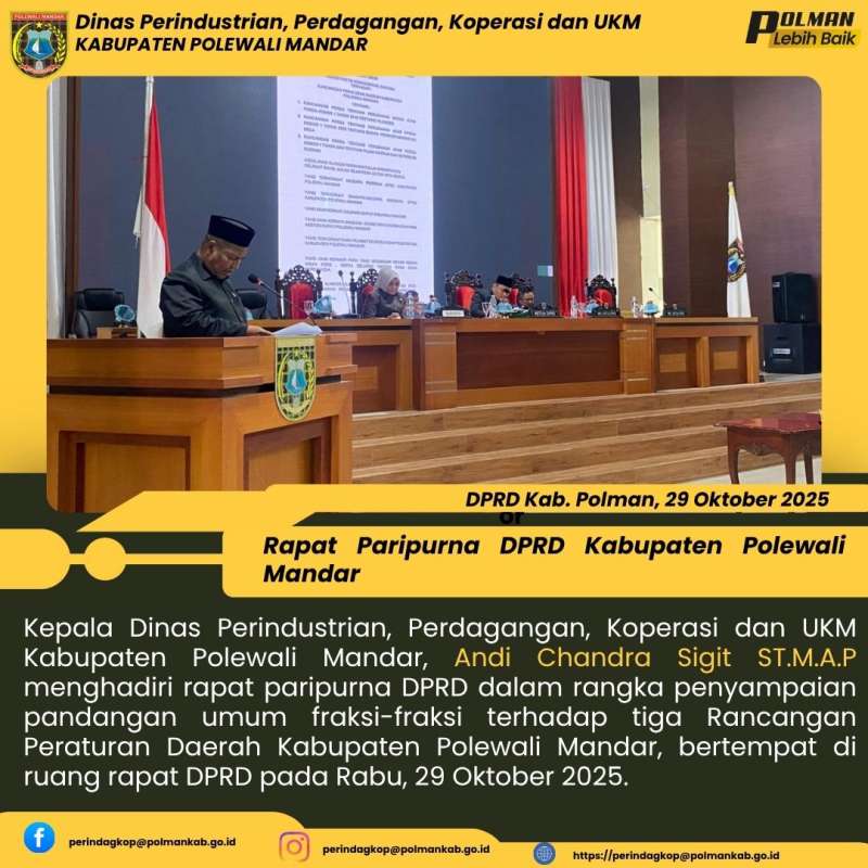 Kepala Dinas Perindustrian, Perdagangan, Koperasi dan UKM Kabupaten Polewali Mandar, Andi Chandra Sigit ST.M.A.P menghadiri rapat paripurna DPRD dalam rangka penyampaian pandangan umum fraksi-fraksi terhadap tiga Rancangan Peraturan Daerah Kabupaten Polewali Mandar, bertempat di ruang rapat DPRD pada Rabu, 29 Oktober 2025.