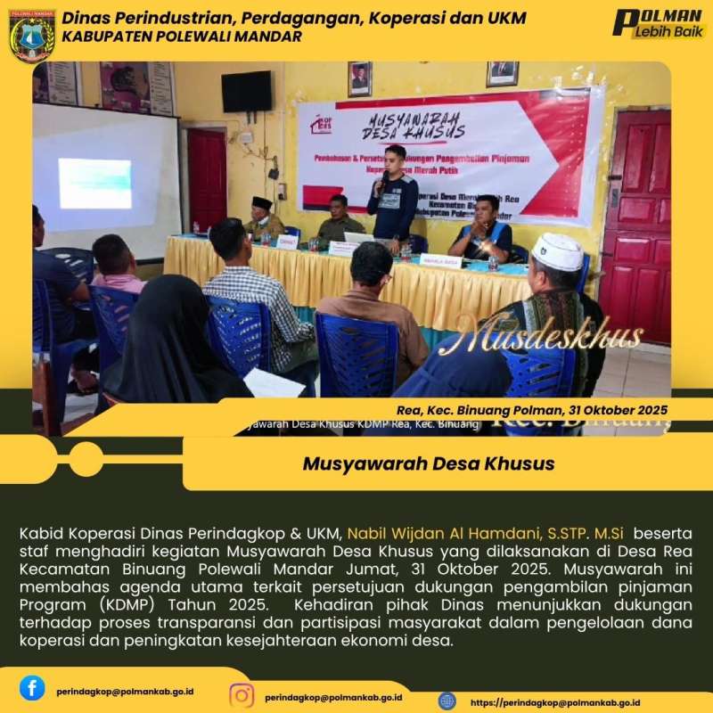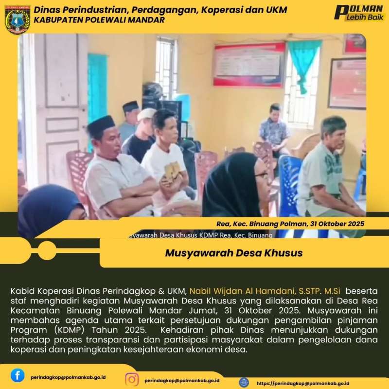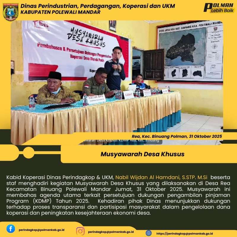 Kabid Koperasi Dinas Perindagkop & UKM, Nabil Wijdan Al Hamdani, S.STP. M.Si beserta staf menghadiri kegiatan Musyawarah Desa Khusus yang dilaksanakan di Desa Rea Kecamatan Binuang Polewali Mandar Jumat, 31 Oktober 2025. Musyawarah ini membahas agenda utama terkait persetujuan dukungan pengambilan pinjaman Program (KDMP) Tahun 2025. Kehadiran pihak Dinas menunjukkan dukungan terhadap proses transparansi dan partisipasi masyarakat dalam pengelolaan dana koperasi dan peningkatan kesejahteraan ekonomi desa.