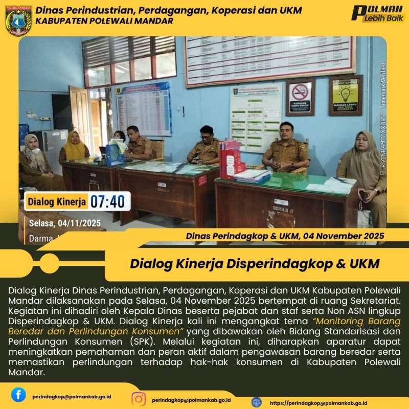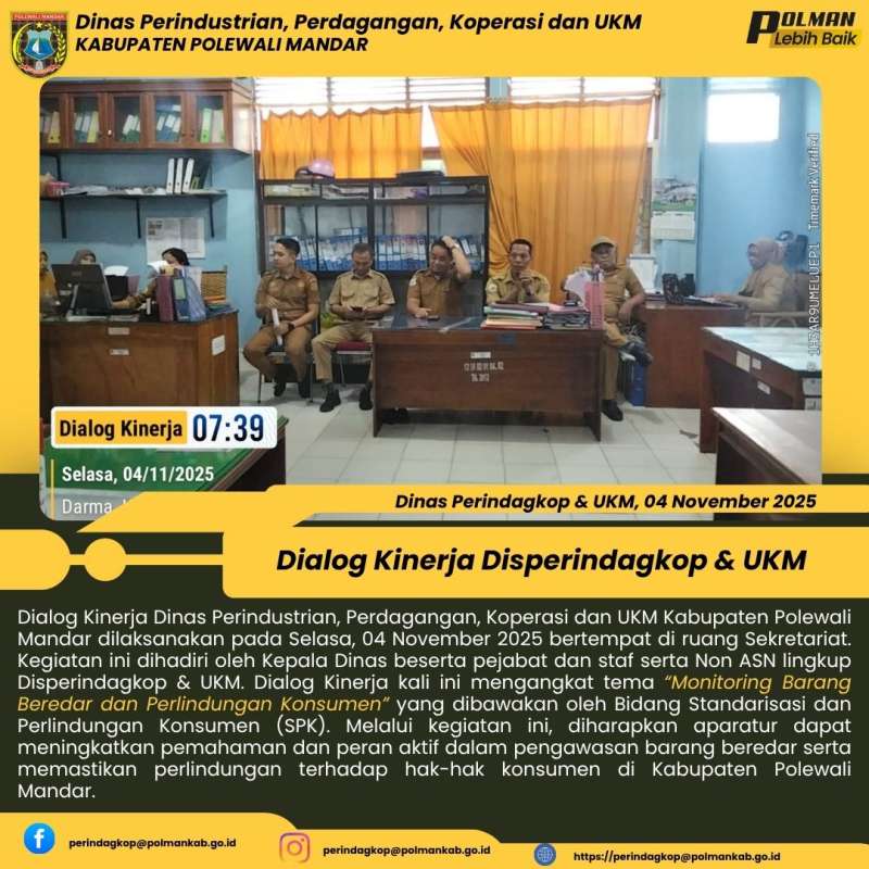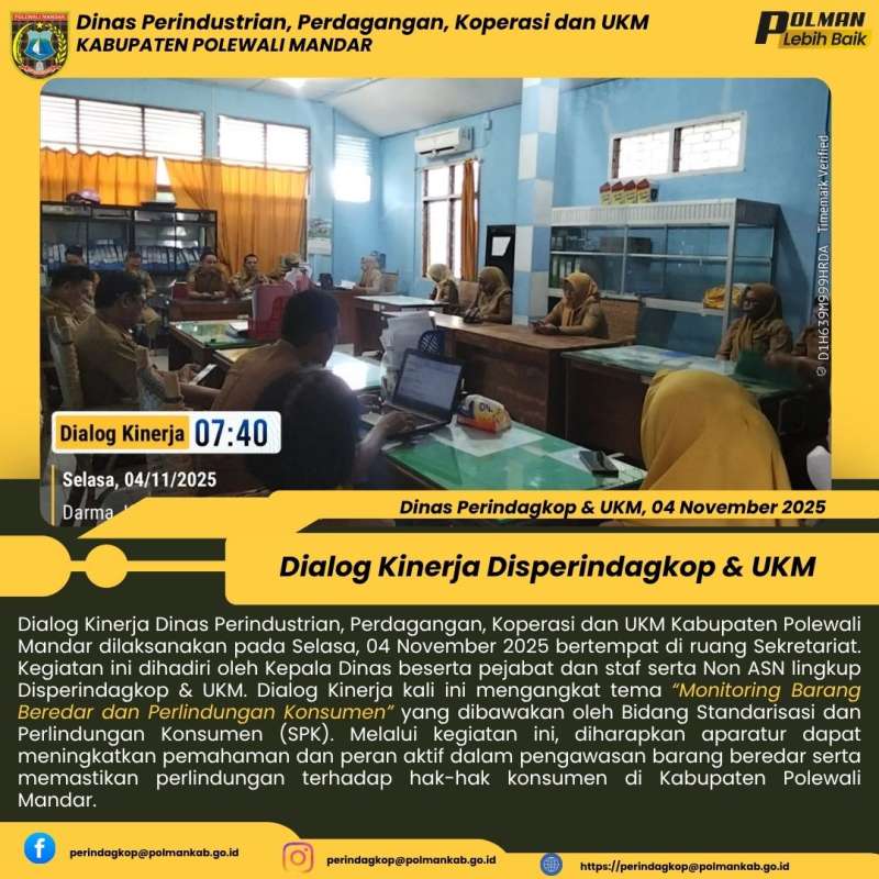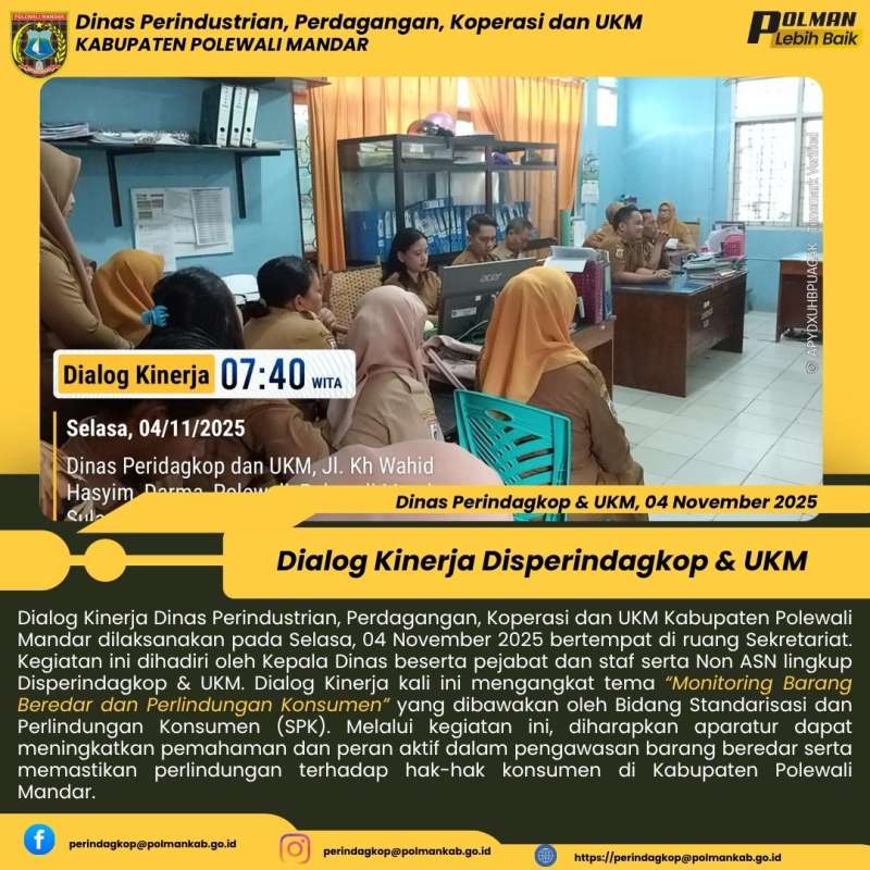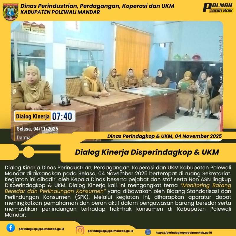 Dialog Kinerja Dinas Perindustrian, Perdagangan, Koperasi dan UKM Kabupaten Polewali Mandar dilaksanakan pada Selasa, 04 November 2025 bertempat di ruang Sekretariat. Kegiatan ini dihadiri oleh Kepala Dinas beserta pejabat dan staf serta Non ASN lingkup Disperindagkop & UKM. Dialog Kinerja kali ini mengangkat tema “Monitoring Barang Beredar dan Perlindungan Konsumen” yang dibawakan oleh Bidang Standarisasi dan Perlindungan Konsumen (SPK). Melalui kegiatan ini, diharapkan aparatur dapat meningkatkan pemahaman dan peran aktif dalam pengawasan barang beredar serta memastikan perlindungan terhadap hak-hak konsumen di Kabupaten Polewali Mandar.