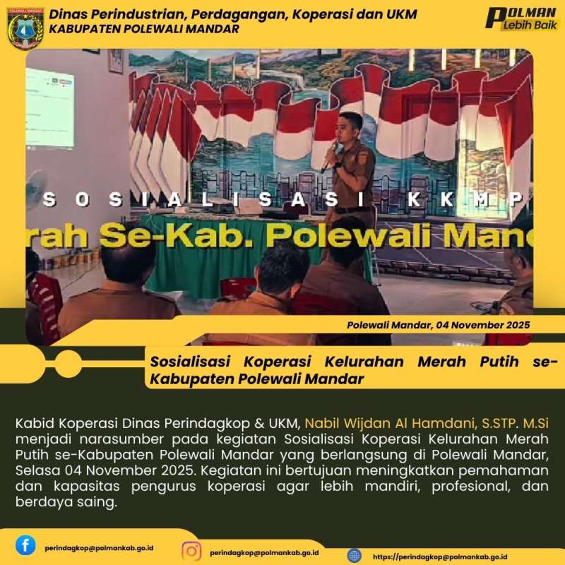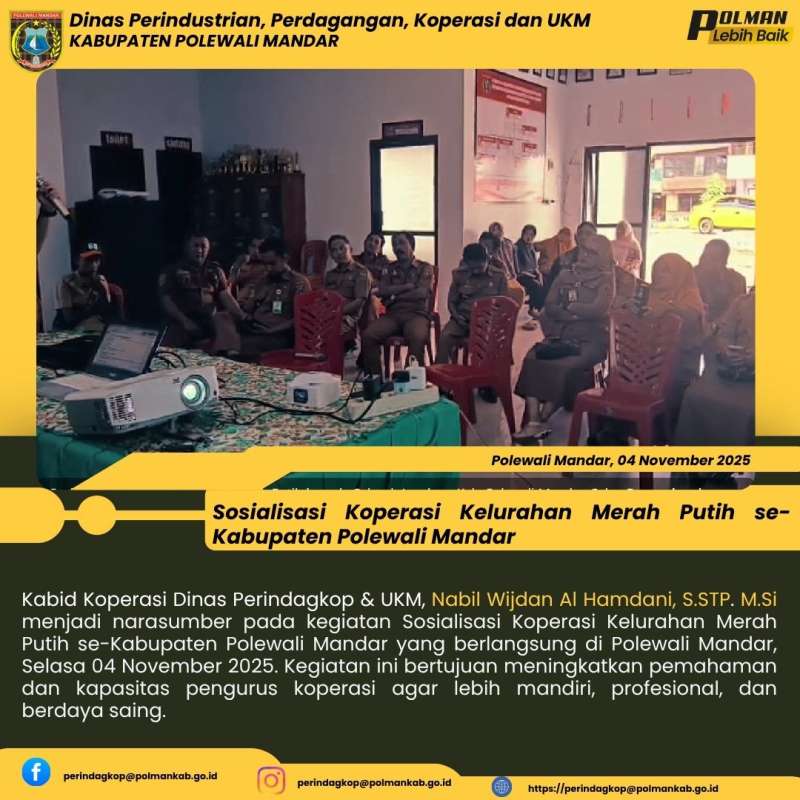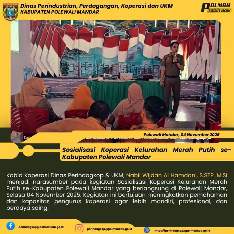Kabid Koperasi Dinas Perindagkop & UKM, Nabil Wijdan Al Hamdani, S.STP. M.Si menjadi narasumber pada kegiatan Sosialisasi Koperasi Kelurahan Merah Putih se-Kabupaten Polewali Mandar yang berlangsung di Polewali Mandar, Selasa 04 November 2025. Kegiatan ini bertujuan meningkatkan pemahaman dan kapasitas pengurus koperasi agar lebih mandiri, profesional, dan berdaya saing.