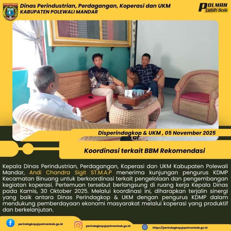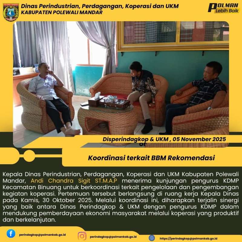 Kepala Dinas Perindustrian, Perdagangan, Koperasi dan UKM Kabupaten Polewali Mandar, Andi Chandra Sigit ST.M.A.P menerima kunjungan pengurus KDMP Kecamatan Binuang untuk berkoordinasi terkait pengelolaan dan pengembangan kegiatan koperasi. Pertemuan tersebut berlangsung di ruang kerja Kepala Dinas pada Kamis, 30 Oktober 2025. Melalui koordinasi ini, diharapkan terjalin sinergi yang baik antara Dinas Perindagkop & UKM dengan pengurus KDMP dalam mendukung pemberdayaan ekonomi masyarakat melalui koperasi yang produktif dan berkelanjutan....