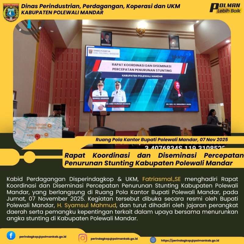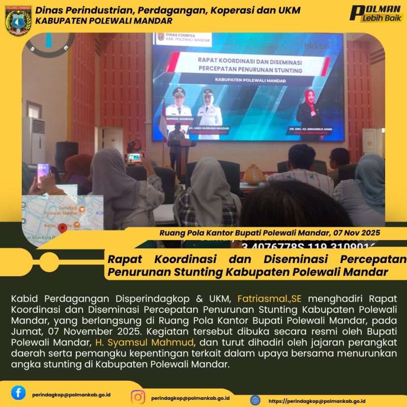 Kabid Perdagangan Disperindagkop & UKM, Fatriasmal.,SE menghadiri Rapat Koordinasi dan Diseminasi Percepatan Penurunan Stunting Kabupaten Polewali Mandar, yang berlangsung di Ruang Pola Kantor Bupati Polewali Mandar, pada Jumat, 07 November 2025. Kegiatan tersebut dibuka secara resmi oleh Bupati Polewali Mandar, H. Syamsul Mahmud, dan turut dihadiri oleh jajaran perangkat daerah serta pemangku kepentingan terkait dalam upaya bersama menurunkan angka stunting di Kabupaten Polewali Mandar.
