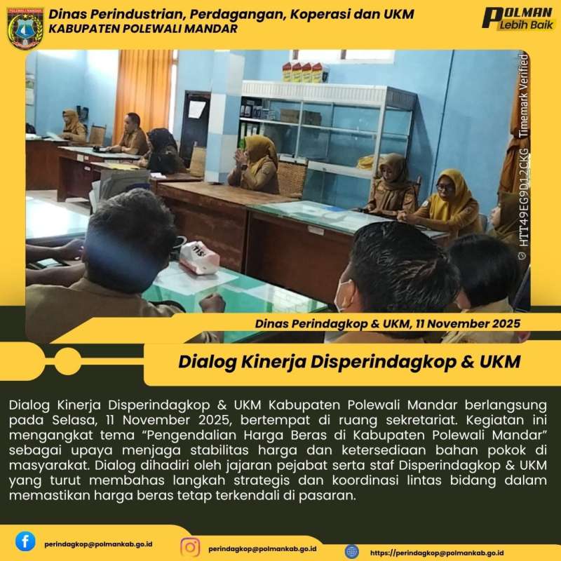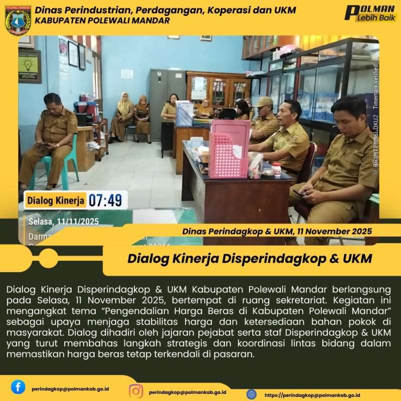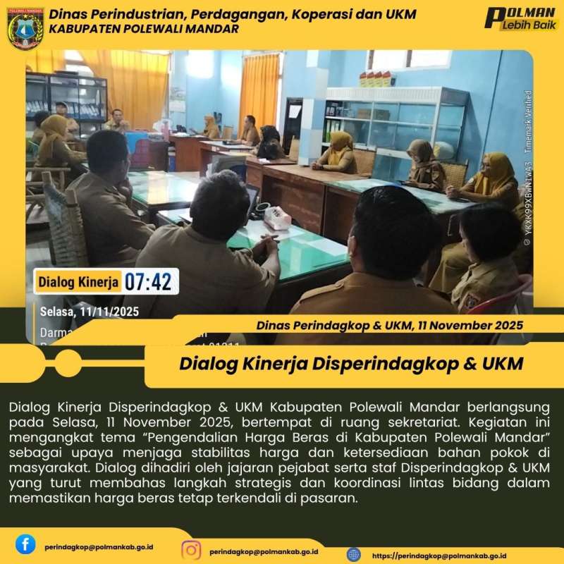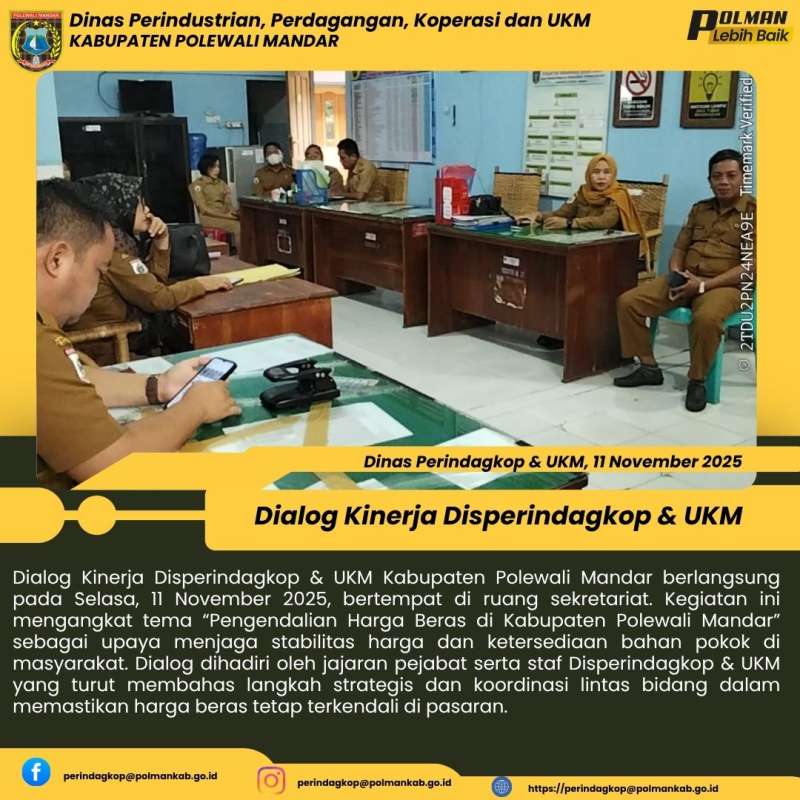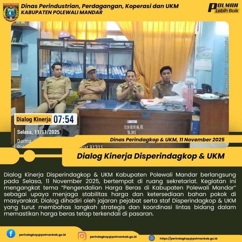 Dialog Kinerja Disperindagkop & UKM Kabupaten Polewali Mandar berlangsung pada Selasa, 11 November 2025, bertempat di ruang sekretariat. Kegiatan ini mengangkat tema “Pengendalian Harga Beras di Kabupaten Polewali Mandar” sebagai upaya menjaga stabilitas harga dan ketersediaan bahan pokok di masyarakat. Dialog dihadiri oleh jajaran pejabat serta staf Disperindagkop & UKM yang turut membahas langkah strategis dan koordinasi lintas bidang dalam memastikan harga beras tetap terkendali di pasaran.