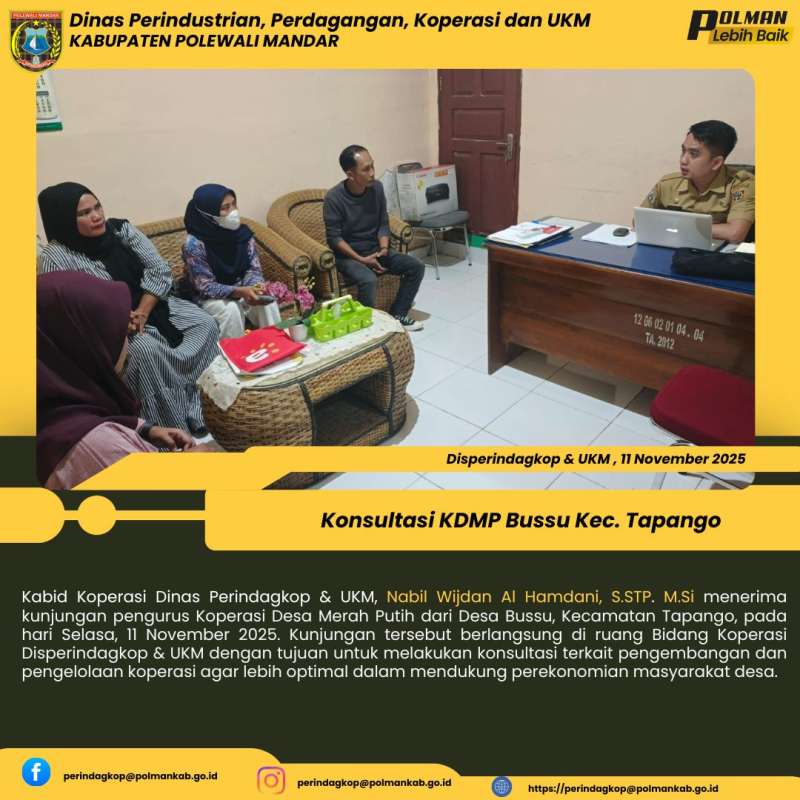 Kabid Koperasi Dinas Perindagkop & UKM, Nabil Wijdan Al Hamdani, S.STP. M.Si menerima kunjungan pengurus Koperasi Desa Merah Putih dari Desa Bussu, Kecamatan Tapango, pada hari Selasa, 11 November 2025. Kunjungan tersebut berlangsung di ruang Bidang Koperasi Disperindagkop & UKM dengan tujuan untuk melakukan konsultasi terkait pengembangan dan pengelolaan koperasi agar lebih optimal dalam mendukung perekonomian masyarakat desa.