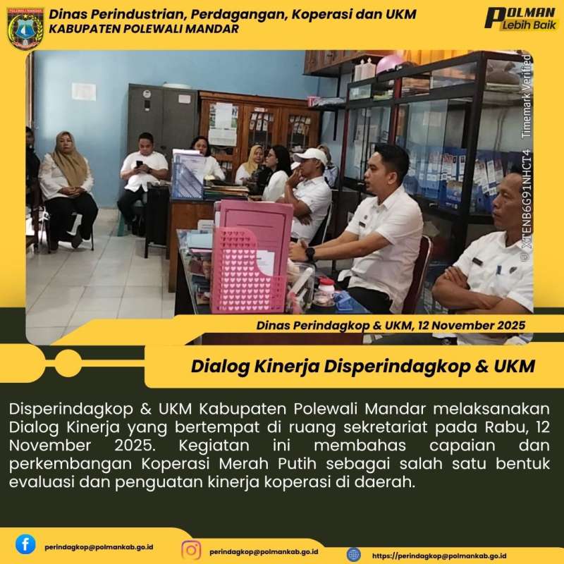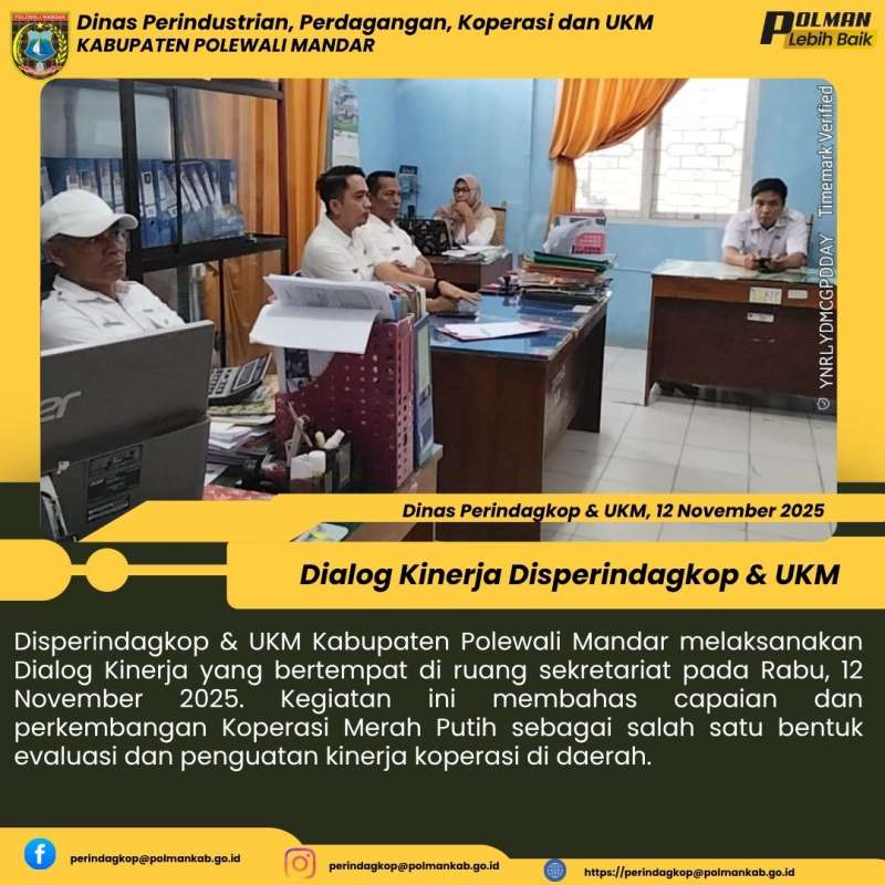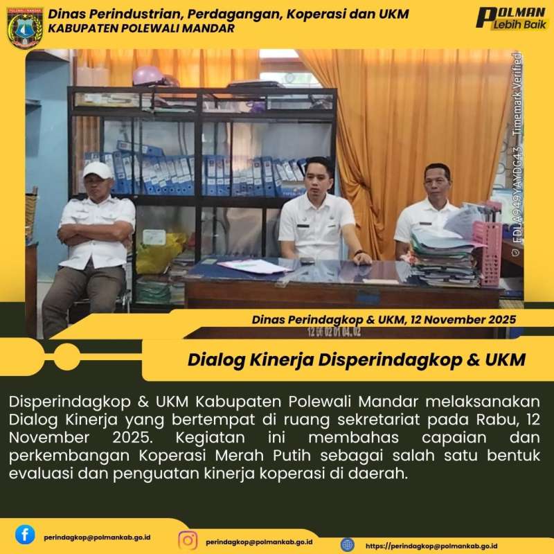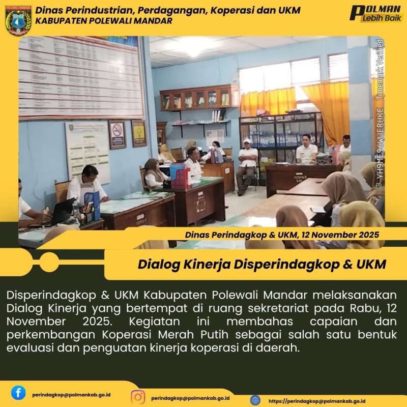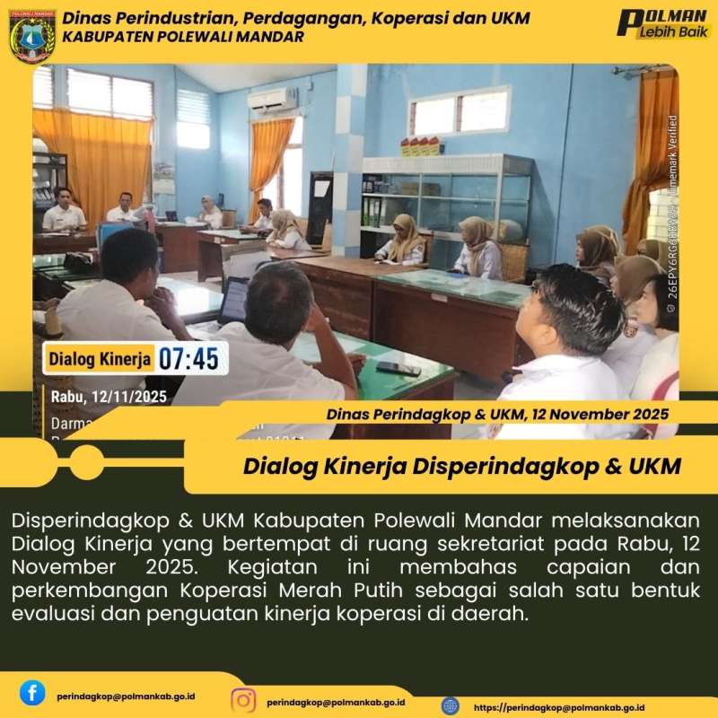 Disperindagkop & UKM Kabupaten Polewali Mandar melaksanakan Dialog Kinerja yang bertempat di ruang sekretariat pada Rabu, 12 November 2025. Kegiatan ini membahas capaian dan perkembangan Koperasi Merah Putih sebagai salah satu bentuk evaluasi dan penguatan kinerja koperasi di daerah.