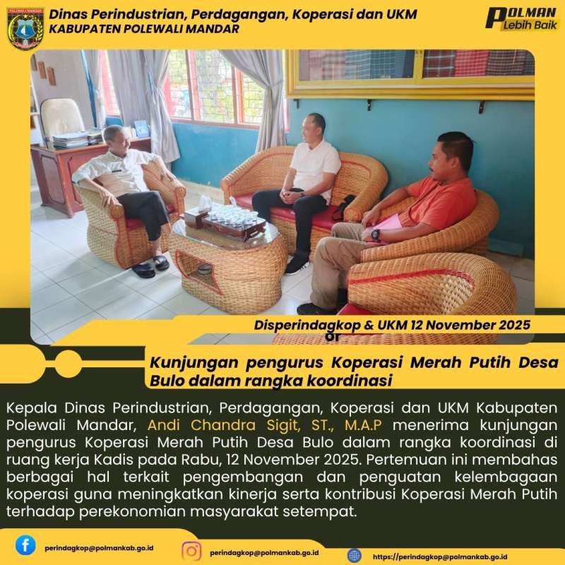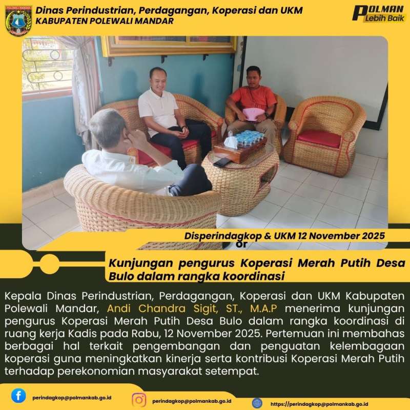 Kepala Dinas Perindustrian, Perdagangan, Koperasi dan UKM Kabupaten Polewali Mandar, Andi Chandra Sigit, ST., M.A.P menerima kunjungan pengurus Koperasi Merah Putih Desa Bulo dalam rangka koordinasi di ruang kerja Kadis pada Rabu, 12 November 2025. Pertemuan ini membahas berbagai hal terkait pengembangan dan penguatan kelembagaan koperasi guna meningkatkan kinerja serta kontribusi Koperasi Merah Putih terhadap perekonomian masyarakat setempat.