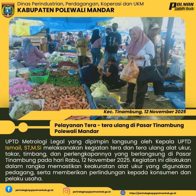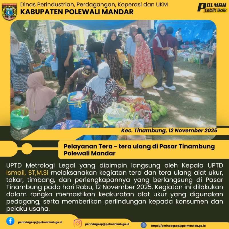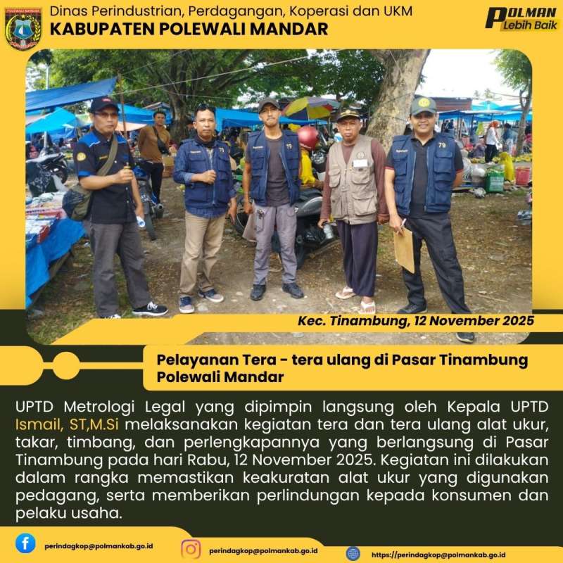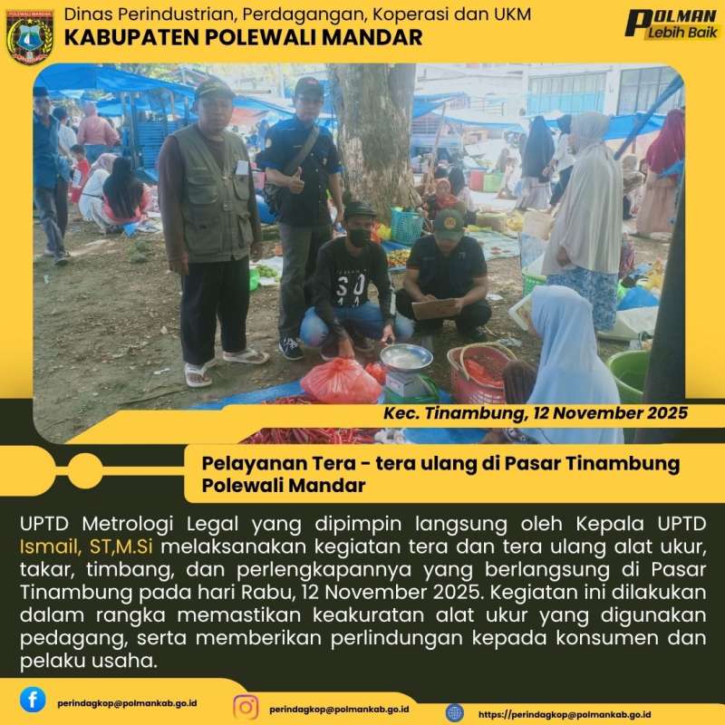 UPTD Metrologi Legal yang dipimpin langsung oleh Kepala UPTD Ismail, ST,M.Si melaksanakan kegiatan tera dan tera ulang alat ukur, takar, timbang, dan perlengkapannya yang berlangsung di Pasar Tinambung pada hari Rabu, 12 November 2025. Kegiatan ini dilakukan dalam rangka memastikan keakuratan alat ukur yang digunakan pedagang, serta memberikan perlindungan kepada konsumen dan pelaku usaha.