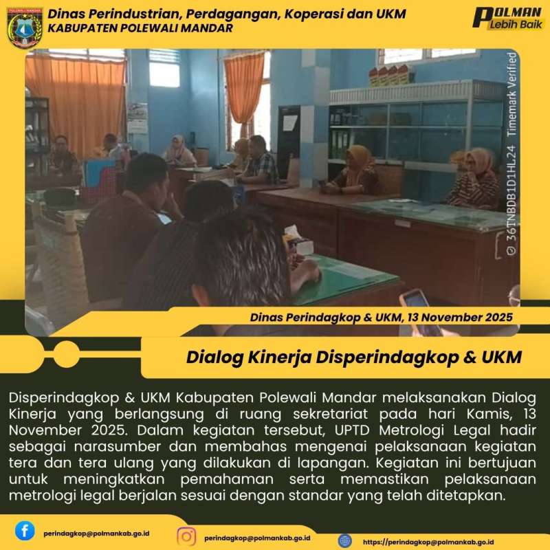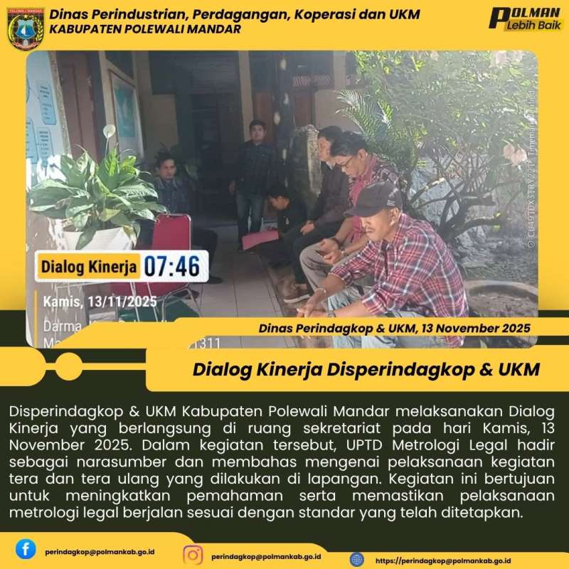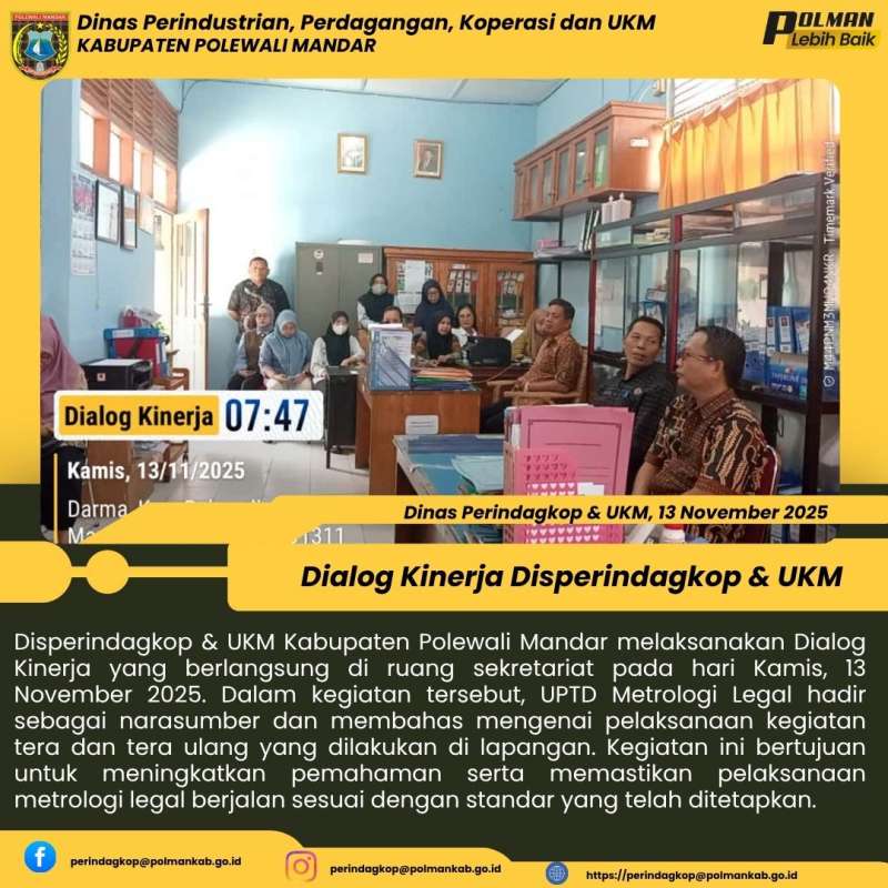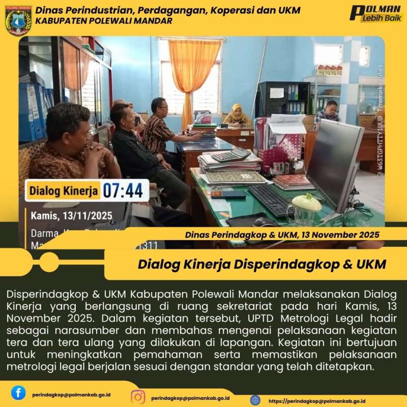 Disperindagkop & UKM Kabupaten Polewali Mandar melaksanakan Dialog Kinerja yang berlangsung di ruang sekretariat pada hari Kamis, 13 November 2025. Dalam kegiatan tersebut, UPTD Metrologi Legal hadir sebagai narasumber dan membahas mengenai pelaksanaan kegiatan tera dan tera ulang yang dilakukan di lapangan. Kegiatan ini bertujuan untuk meningkatkan pemahaman serta memastikan pelaksanaan metrologi legal berjalan sesuai dengan standar yang telah ditetapkan.