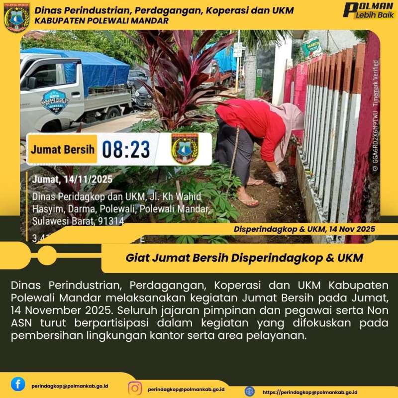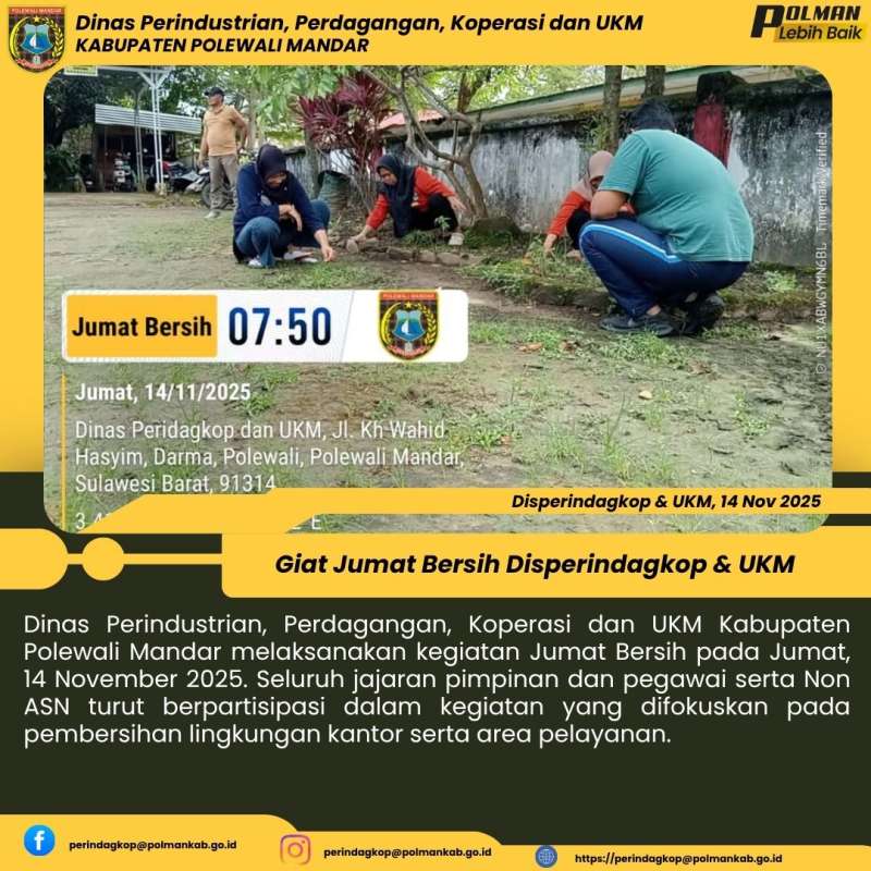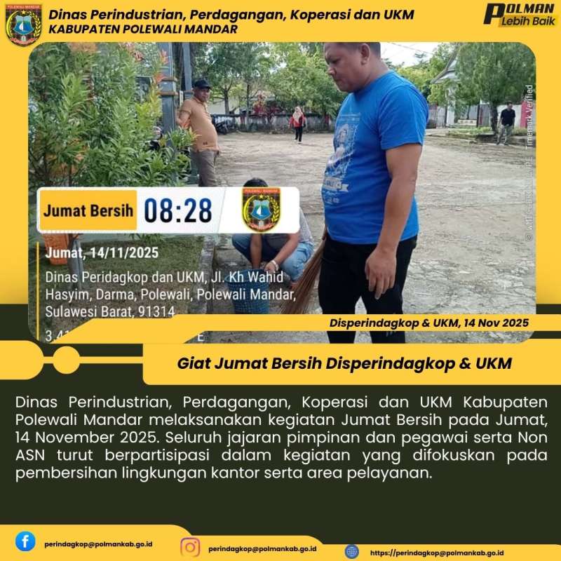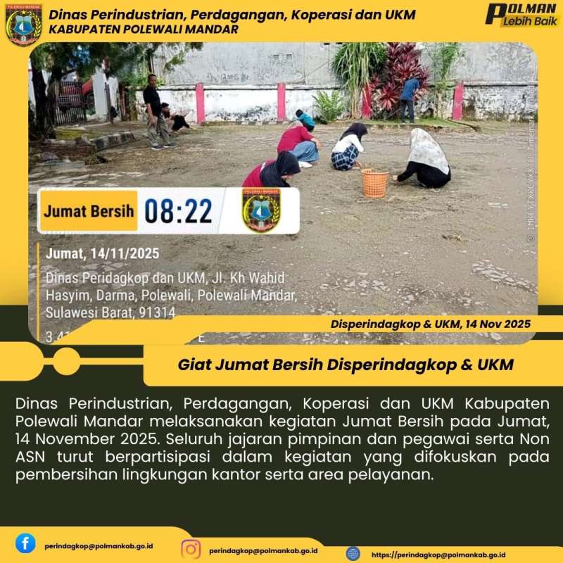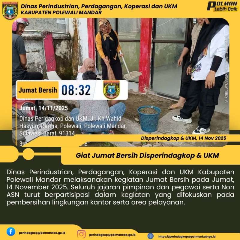 Dinas Perindustrian, Perdagangan, Koperasi dan UKM Kabupaten Polewali Mandar melaksanakan kegiatan Jumat Bersih pada Jumat, 14 November 2025. Seluruh jajaran pimpinan dan pegawai serta Non ASN turut berpartisipasi dalam kegiatan yang difokuskan pada pembersihan lingkungan kantor serta area pelayanan.