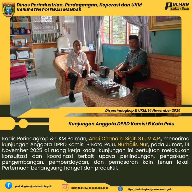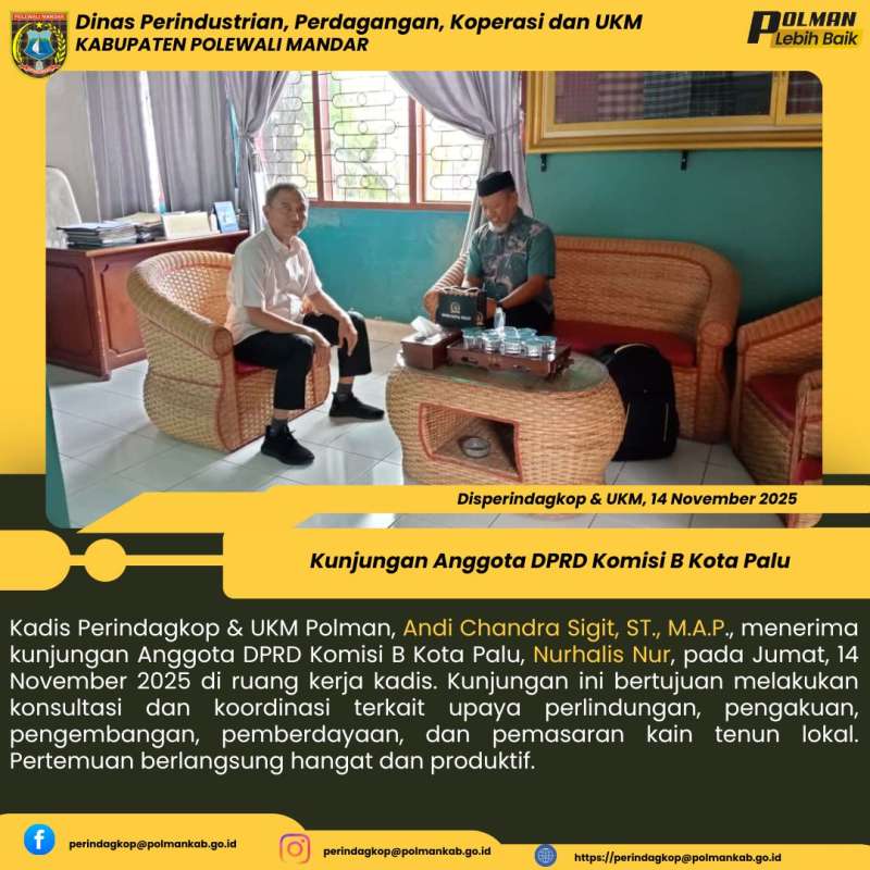 Kadis Perindagkop & UKM Polman, Andi Chandra Sigit, ST., M.A.P., menerima kunjungan Anggota DPRD Komisi B Kota Palu, Nurhalis Nur, pada Jumat, 14 November 2025 di ruang kerja kadis. Kunjungan ini bertujuan melakukan konsultasi dan koordinasi terkait upaya perlindungan, pengakuan, pengembangan, pemberdayaan, dan pemasaran kain tenun lokal. Pertemuan berlangsung hangat dan produktif.