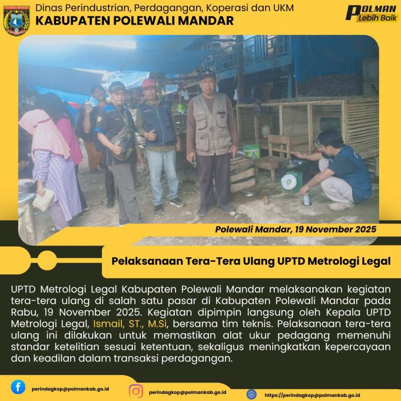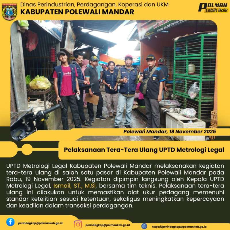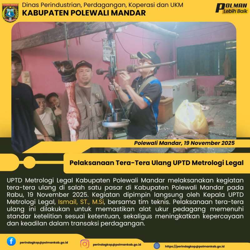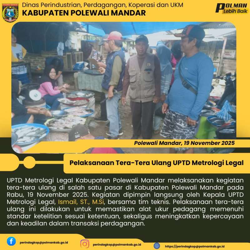 UPTD Metrologi Legal Kabupaten Polewali Mandar melaksanakan kegiatan tera-tera ulang di salah satu pasar di Kabupaten Polewali Mandar pada Rabu, 19 November 2025. Kegiatan dipimpin langsung oleh Kepala UPTD Metrologi Legal, Ismail, ST., M.Si, bersama tim teknis. Pelaksanaan tera-tera ulang ini dilakukan untuk memastikan alat ukur pedagang memenuhi standar ketelitian sesuai ketentuan, sekaligus meningkatkan kepercayaan dan keadilan dalam transaksi perdagangan.