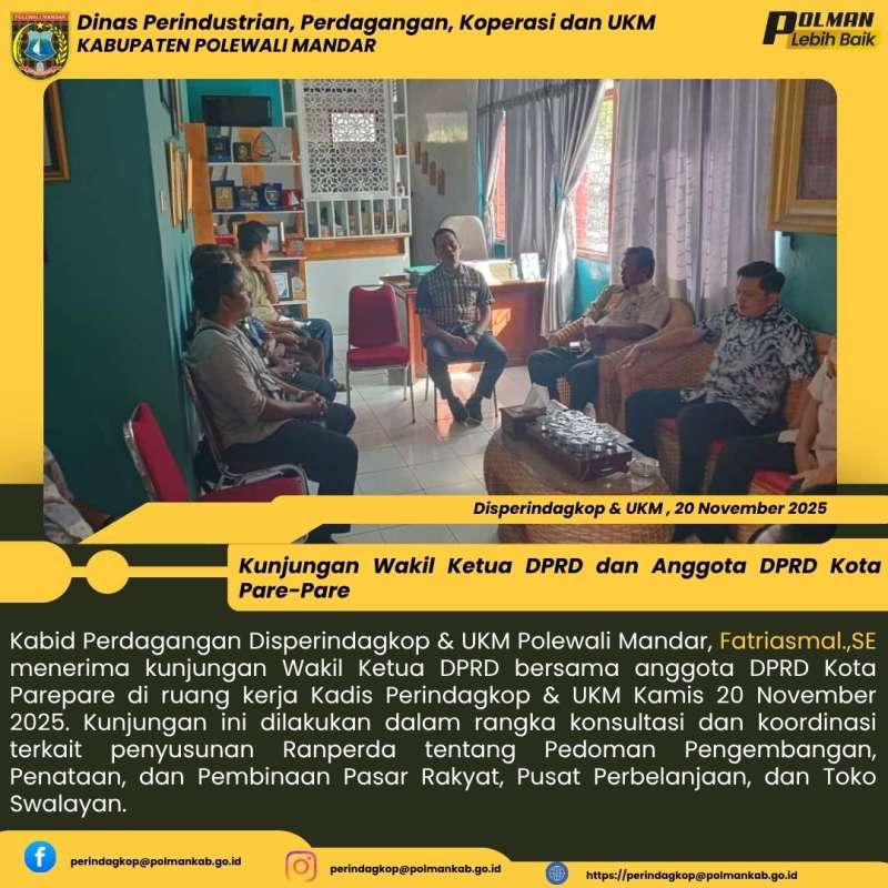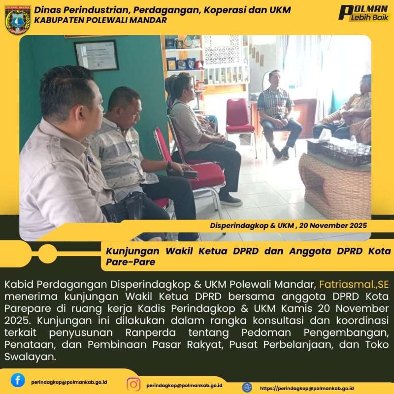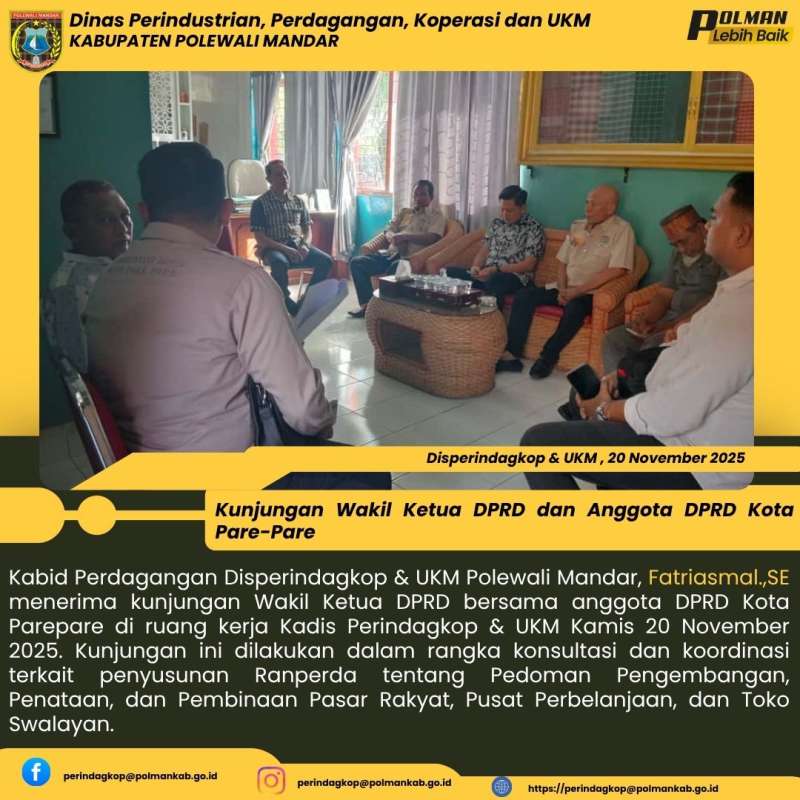 Kabid Perdagangan Disperindagkop & UKM Polewali Mandar, Fatriasmal.,SE menerima kunjungan Wakil Ketua DPRD bersama anggota DPRD Kota Parepare di ruang kerja Kadis Perindagkop & UKM Kamis 20 November 2025. Kunjungan ini dilakukan dalam rangka konsultasi dan koordinasi terkait penyusunan Ranperda tentang Pedoman Pengembangan, Penataan, dan Pembinaan Pasar Rakyat, Pusat Perbelanjaan, dan Toko Swalayan.