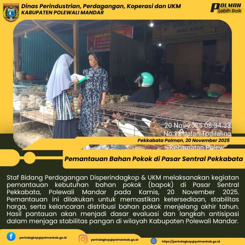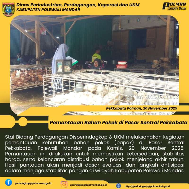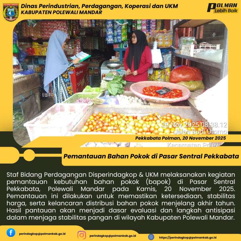Staf Bidang Perdagangan Disperindagkop & UKM melaksanakan kegiatan pemantauan kebutuhan bahan pokok (bapok) di Pasar Sentral Pekkabata, Polewali Mandar pada Kamis, 20 November 2025. Pemantauan ini dilakukan untuk memastikan ketersediaan, stabilitas harga, serta kelancaran distribusi bahan pokok menjelang akhir tahun. Hasil pantauan akan menjadi dasar evaluasi dan langkah antisipasi dalam menjaga stabilitas pangan di wilayah Kabupaten Polewali Mandar.