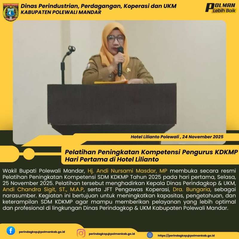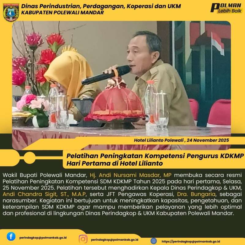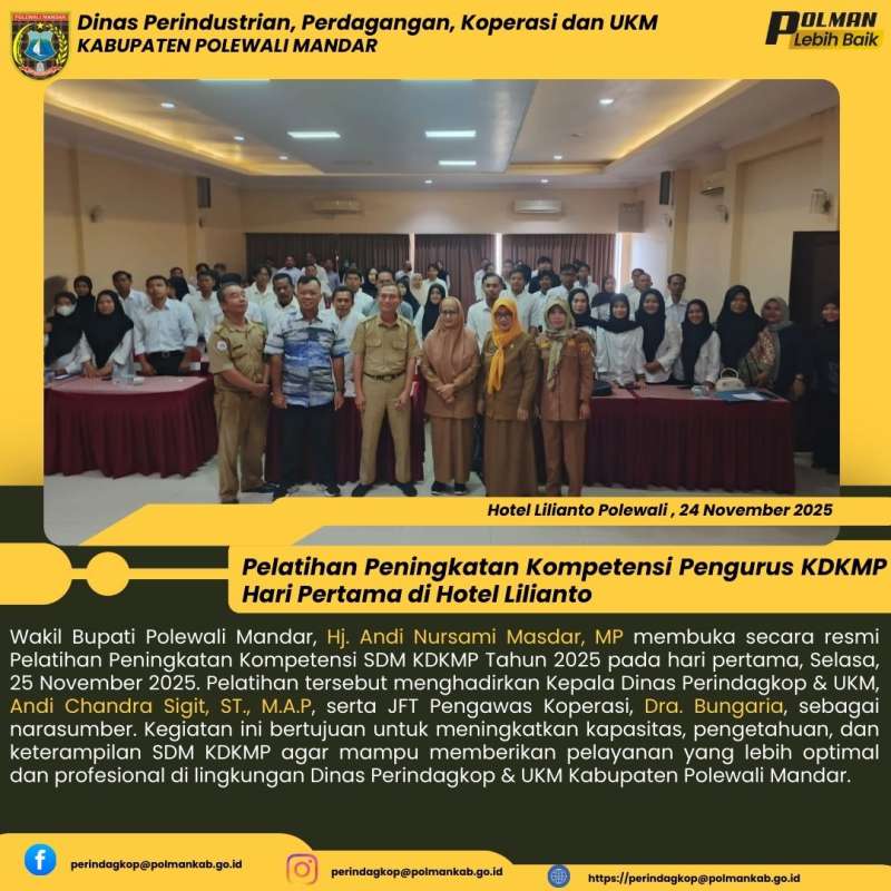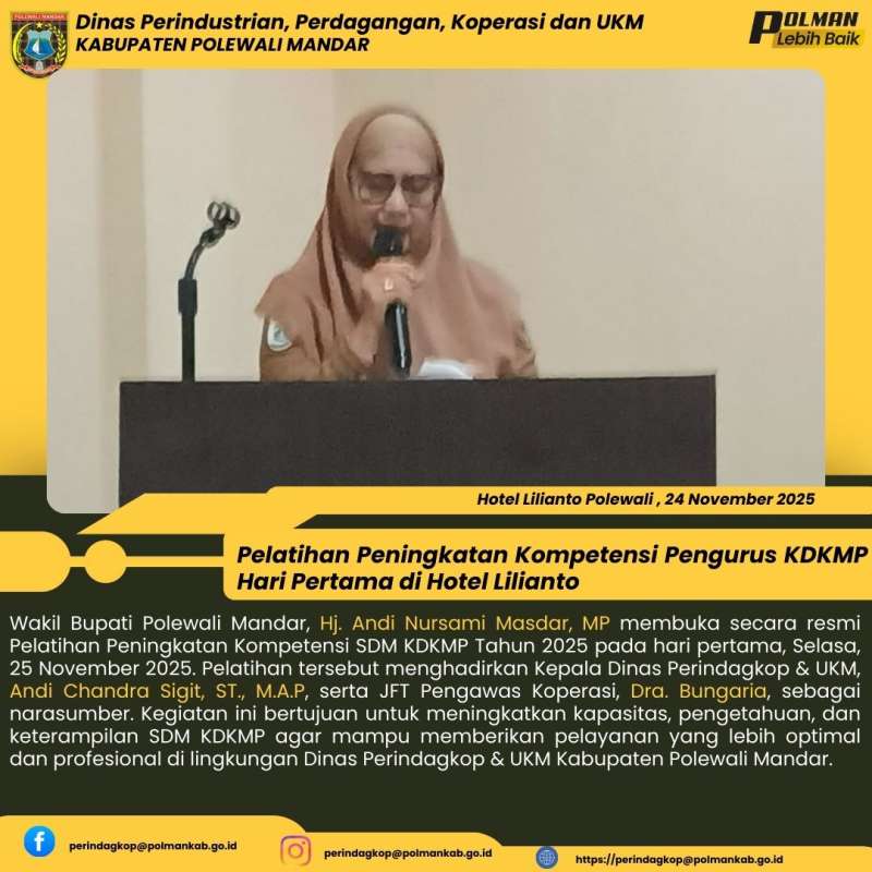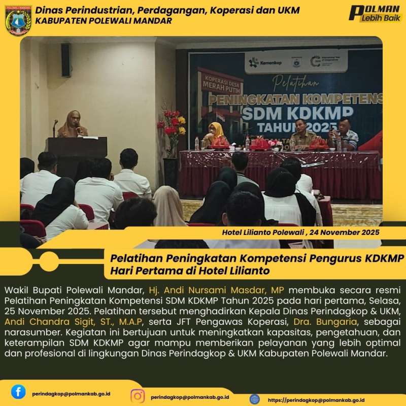 Wakil Bupati Polewali Mandar, Hj. Andi Nursami Masdar, MP bersama Kepala Dinas Perindagkop & UKM, Andi Chandra Sigit, ST., M.A.P, beserta JFT Pengawas Koperasi, Dra. Bungariah dan staf secara resmi membuka Pelatihan Peningkatan Kompetensi SDM KDKMP Tahun 2025 pada hari pertama, Selasa, 25 November 2025. Kegiatan ini dilaksanakan sebagai upaya meningkatkan kapasitas dan kualitas sumber daya manusia dalam mendukung optimalisasi pelayanan serta pengembangan KDKMP. Pelatihan diikuti oleh para peserta dari berbagai unit terkait dan diharapkan dapat menjadi langkah strategis dalam meningkatkan kinerja serta profesionalisme aparatur di lingkungan Dinas Perindagkop & UKM Kabupaten Polewali Mandar.