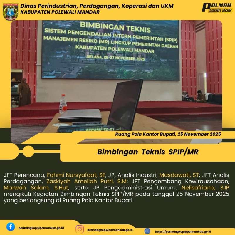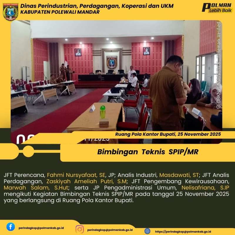 JFT Perencana, Fahmi Nursyafaat, SE, JP; Analis Industri, Masdawati, ST; JFT Analis Perdagangan, Zaskiyah Ameliah Putri, S.M; JFT Pengembang Kewirausahaan, Marwah Salam, S.Hut; serta JP Pengadministrasi Umum, Nelisafriana, S.IP mengikuti Kegiatan Bimbingan Teknis SPIP/MR pada tanggal 25 November 2025 yang berlangsung di Ruang Pola Kantor Bupati.