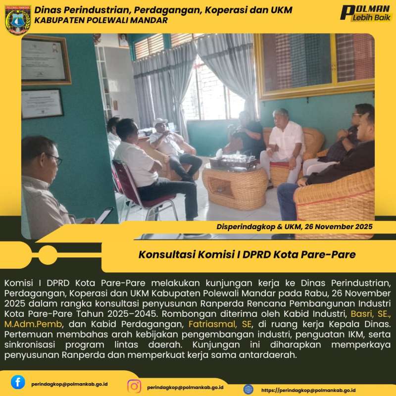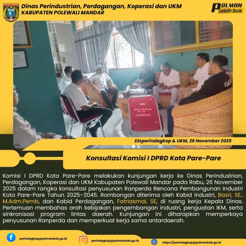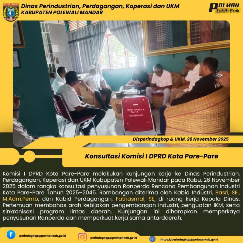 Komisi I DPRD Kota Pare-Pare melakukan kunjungan kerja ke Dinas Perindustrian, Perdagangan, Koperasi dan UKM Kabupaten Polewali Mandar pada Rabu, 26 November 2025 dalam rangka konsultasi penyusunan Ranperda Rencana Pembangunan Industri Kota Pare-Pare Tahun 2025–2045. Rombongan diterima oleh Kabid Industri, Basri, SE., M.Adm.Pemb, dan Kabid Perdagangan, Fatriasmal, SE, di ruang kerja Kepala Dinas. Pertemuan membahas arah kebijakan pengembangan industri, penguatan IKM, serta sinkronisasi program lintas daerah. Kunjungan ini diharapkan memperkaya penyusunan Ranperda dan memperkuat kerja sama antardaerah.