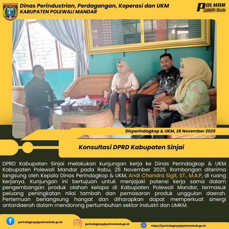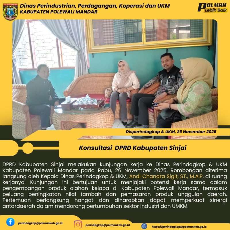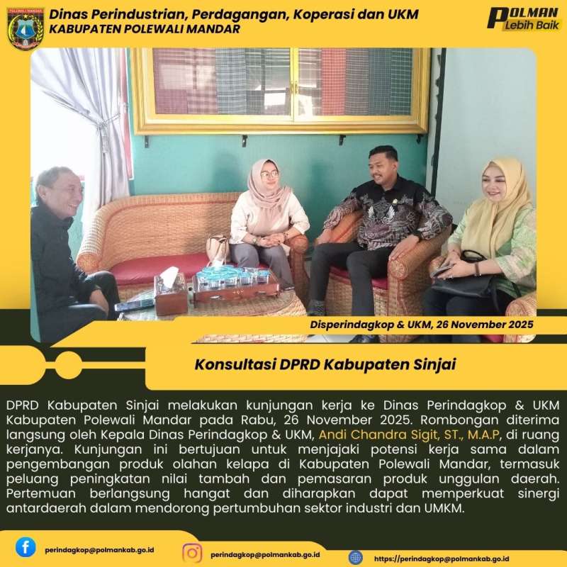 DPRD Kabupaten Sinjai melakukan kunjungan kerja ke Dinas Perindagkop & UKM Kabupaten Polewali Mandar pada Rabu, 26 November 2025. Rombongan diterima langsung oleh Kepala Dinas Perindagkop & UKM, Andi Chandra Sigit, ST., M.A.P, di ruang kerjanya. Kunjungan ini bertujuan untuk menjajaki potensi kerja sama dalam pengembangan produk olahan kelapa di Kabupaten Polewali Mandar, termasuk peluang peningkatan nilai tambah dan pemasaran produk unggulan daerah. Pertemuan berlangsung hangat dan diharapkan dapat memperkuat sinergi antardaerah dalam mendorong pertumbuhan sektor industri dan UMKM.