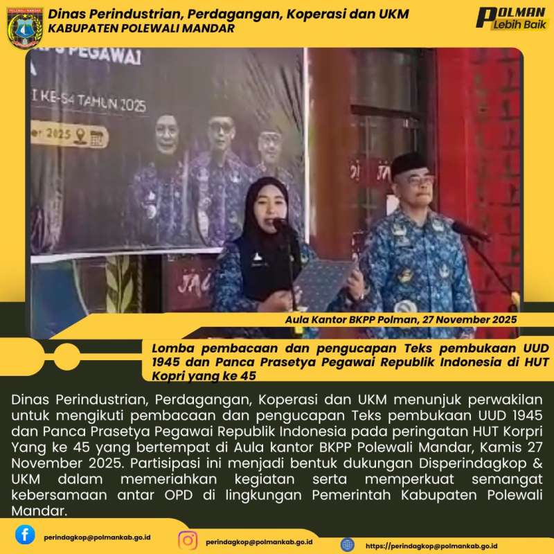 Dinas Perindustrian, Perdagangan, Koperasi dan UKM menunjuk perwakilan untuk mengikuti pembacaan dan pengucapan Teks pembukaan UUD 1945 dan Panca Prasetya Pegawai Republik Indonesia pada peringatan HUT Korpri Yang ke 45 yang bertempat di Aula kantor BKPP Polewali Mandar, Kamis 27 November 2025. Partisipasi ini menjadi bentuk dukungan Disperindagkop & UKM dalam memeriahkan kegiatan serta memperkuat semangat kebersamaan antar OPD di lingkungan Pemerintah Kabupaten Polewali Mandar.