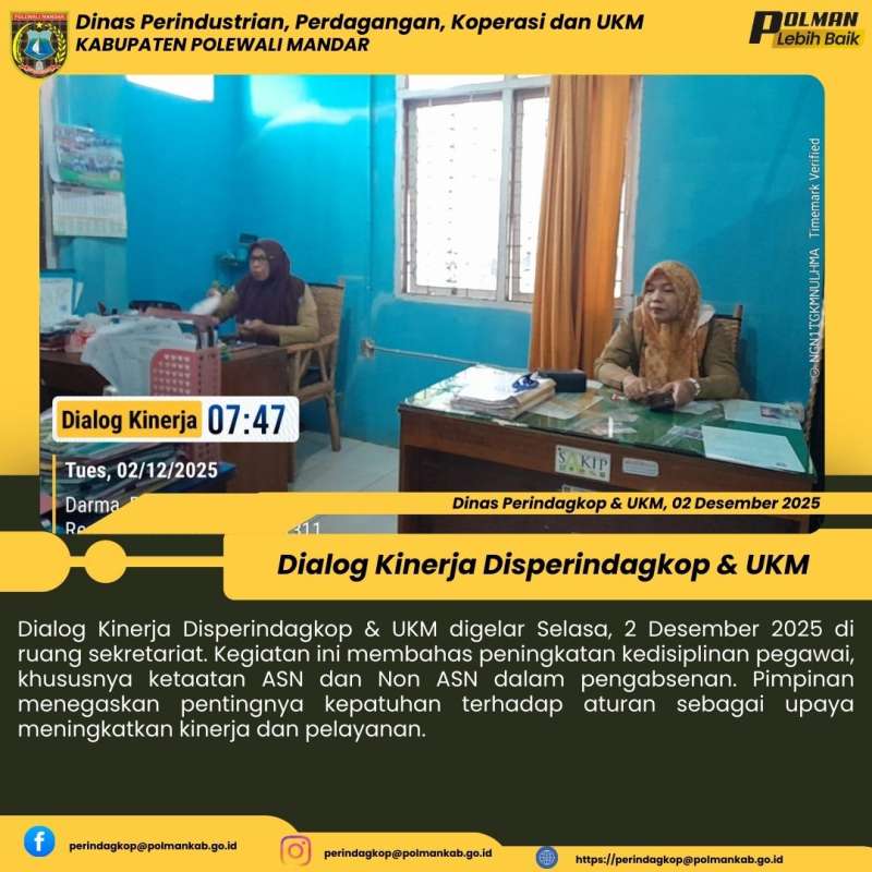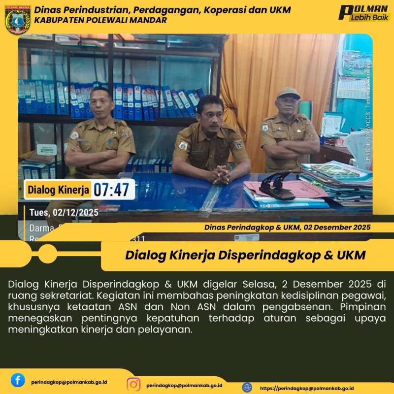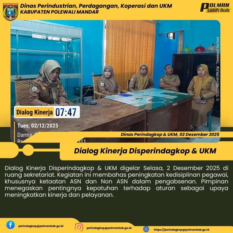 Dialog Kinerja Disperindagkop & UKM digelar Selasa, 2 Desember 2025 di ruang sekretariat. Kegiatan ini membahas peningkatan kedisiplinan pegawai, khususnya ketaatan ASN dan Non ASN dalam pengabsenan. Pimpinan menegaskan pentingnya kepatuhan terhadap aturan sebagai upaya meningkatkan kinerja dan pelayanan.