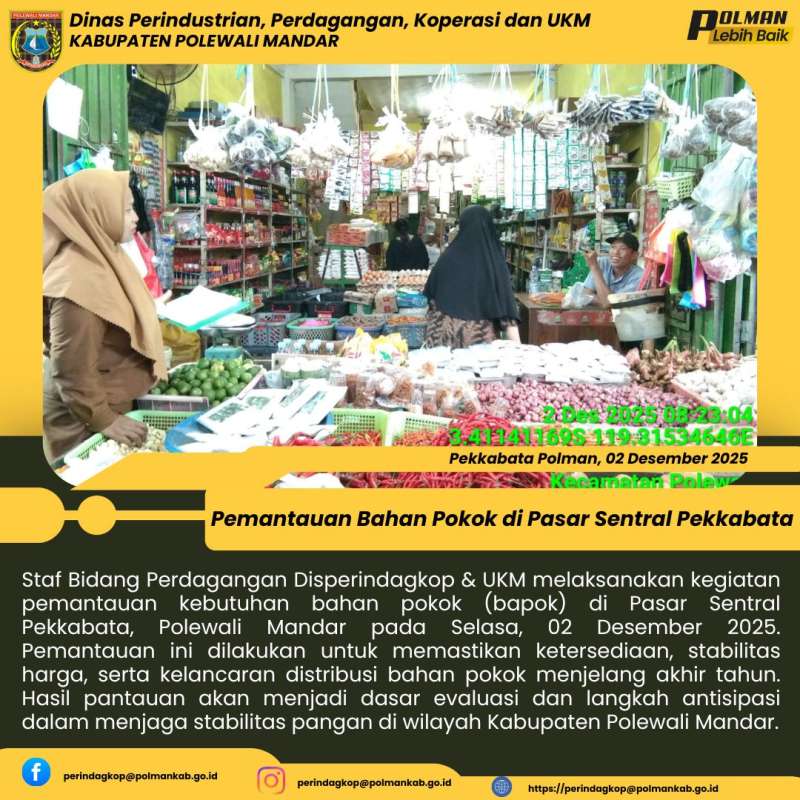 Staf Bidang Perdagangan Disperindagkop & UKM melaksanakan kegiatan pemantauan kebutuhan bahan pokok (bapok) di Pasar Sentral Pekkabata, Polewali Mandar pada Selasa, 02 Desember 2025. Pemantauan ini dilakukan untuk memastikan ketersediaan, stabilitas harga, serta kelancaran distribusi bahan pokok menjelang akhir tahun. Hasil pantauan akan menjadi dasar evaluasi dan langkah antisipasi dalam menjaga stabilitas pangan di wilayah Kabupaten Polewali Mandar.