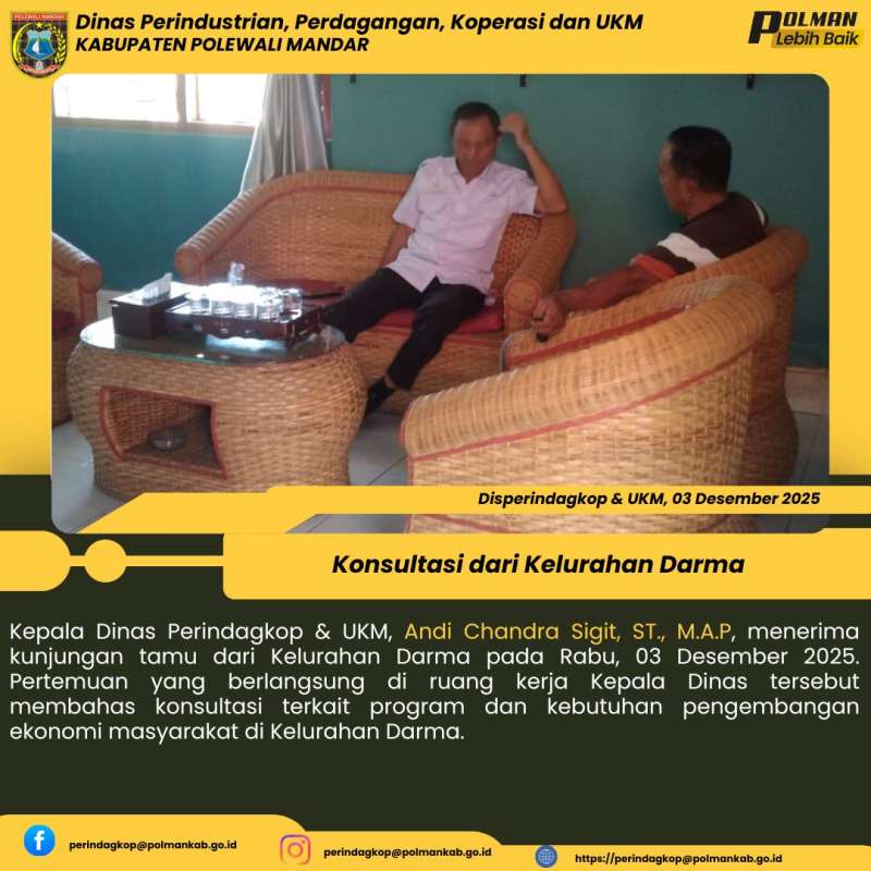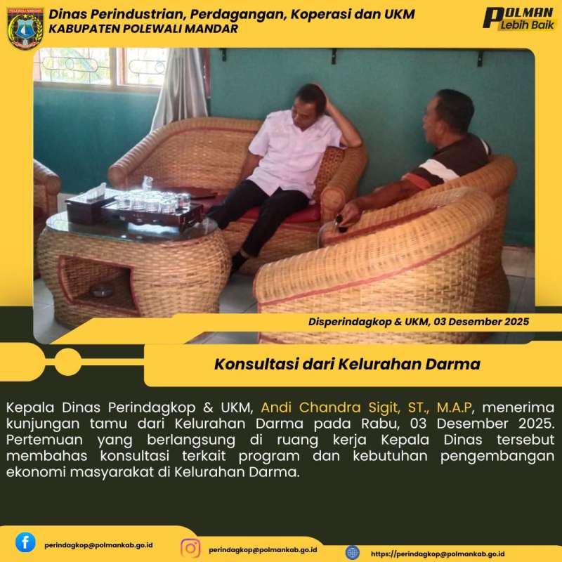 Kepala Dinas Perindagkop & UKM, Andi Chandra Sigit, ST., M.A.P, menerima kunjungan tamu dari Kelurahan Darma pada Rabu, 03 Desember 2025. Pertemuan yang berlangsung di ruang kerja Kepala Dinas tersebut membahas konsultasi terkait program dan kebutuhan pengembangan ekonomi masyarakat di Kelurahan Darma.