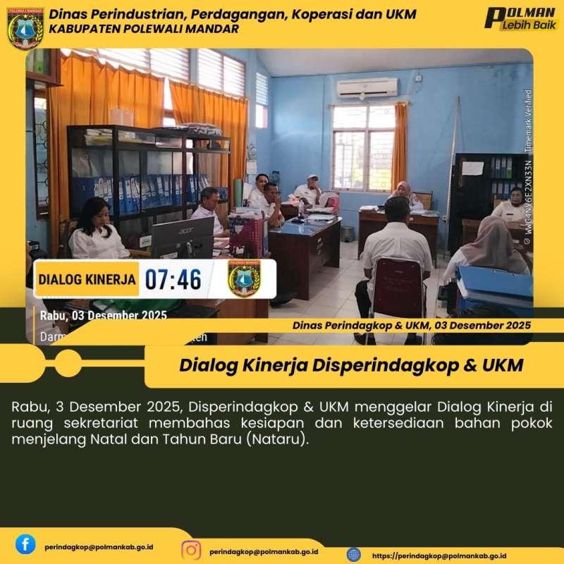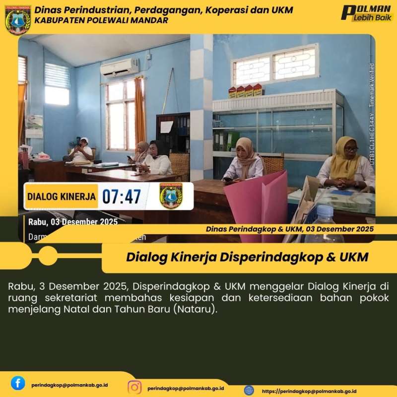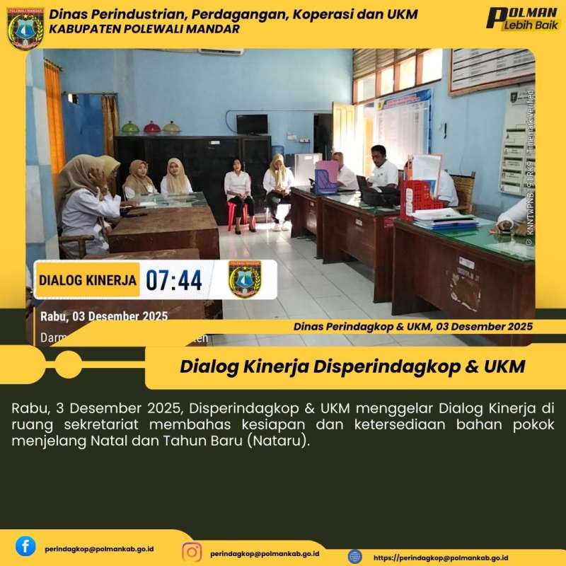 Disperindagkop & UKM Kabupaten Polewali Mandar menggelar Dialog Kinerja pada Rabu, 7 Januari 2026, di ruang sekretariat Bidang Perdagangan. Kegiatan ini membahas perkembangan harga bahan pokok pasca Natal dan Tahun Baru (Nataru) serta kesiapan menghadapi bulan suci Ramadan, guna menjaga stabilitas harga dan ketersediaan barang di pasaran....