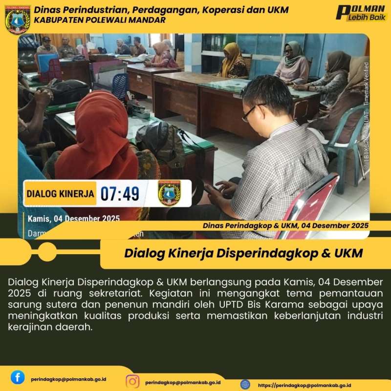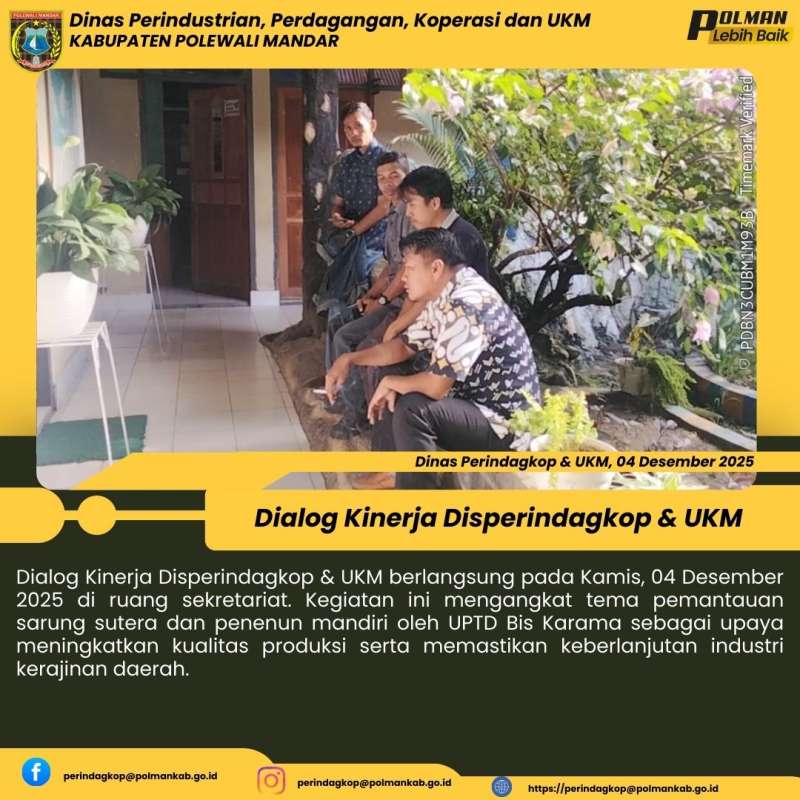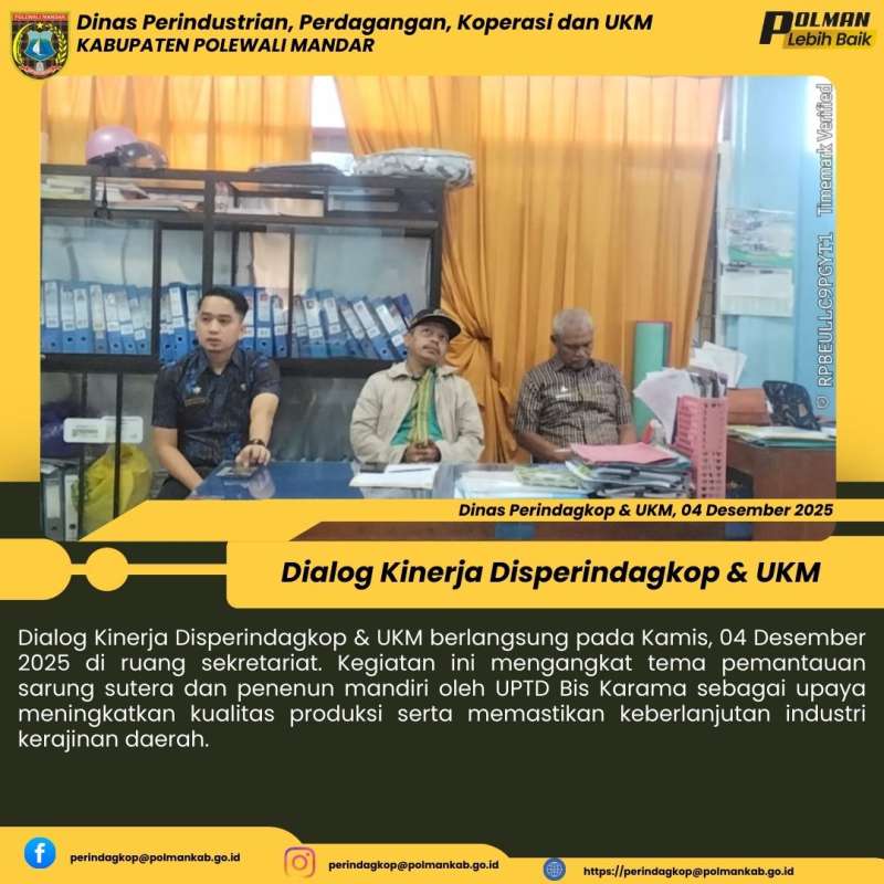 Dialog Kinerja Disperindagkop & UKM berlangsung pada Kamis, 04 Desember 2025 di ruang sekretariat. Kegiatan ini mengangkat tema pemantauan sarung sutera dan penenun mandiri oleh UPTD Bis Karama sebagai upaya meningkatkan kualitas produksi serta memastikan keberlanjutan industri kerajinan daerah.