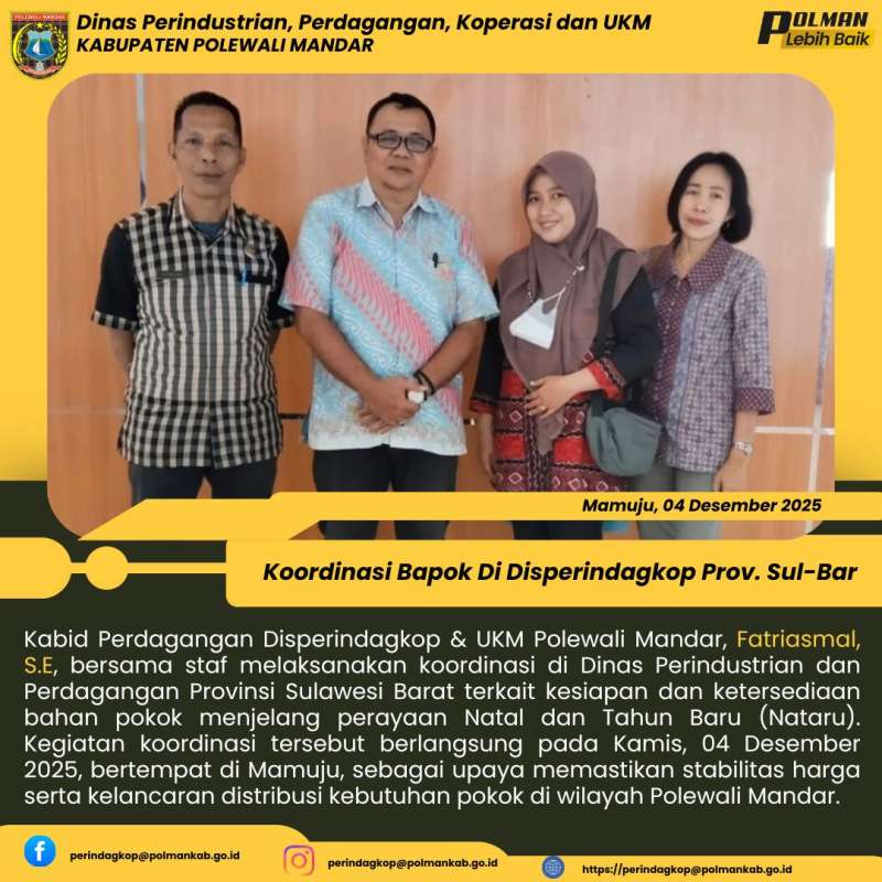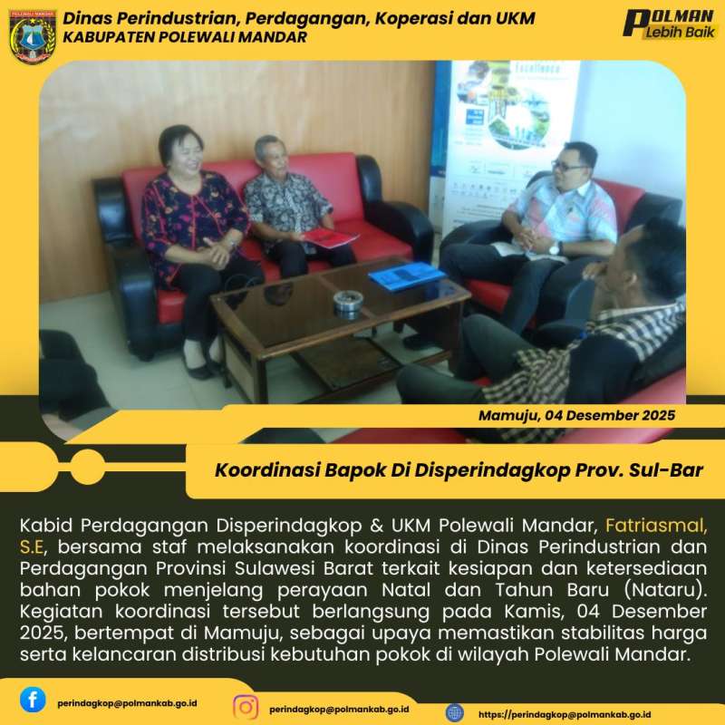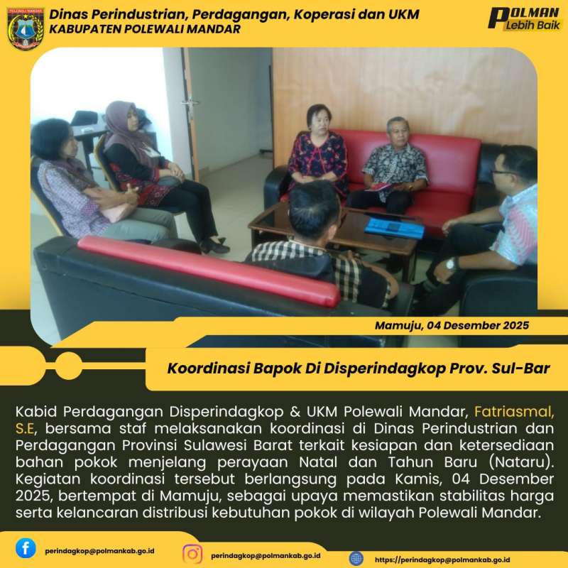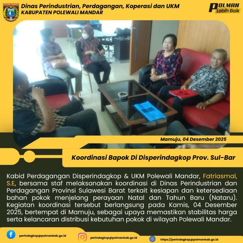 Kabid Perdagangan Disperindagkop & UKM Polewali Mandar, Fatriasmal, S.E, bersama staf melaksanakan koordinasi di Dinas Perindustrian dan Perdagangan Provinsi Sulawesi Barat terkait kesiapan dan ketersediaan bahan pokok menjelang perayaan Natal dan Tahun Baru (Nataru). Kegiatan koordinasi tersebut berlangsung pada Kamis, 04 Desember 2025, bertempat di Mamuju, sebagai upaya memastikan stabilitas harga serta kelancaran distribusi kebutuhan pokok di wilayah Polewali Mandar.