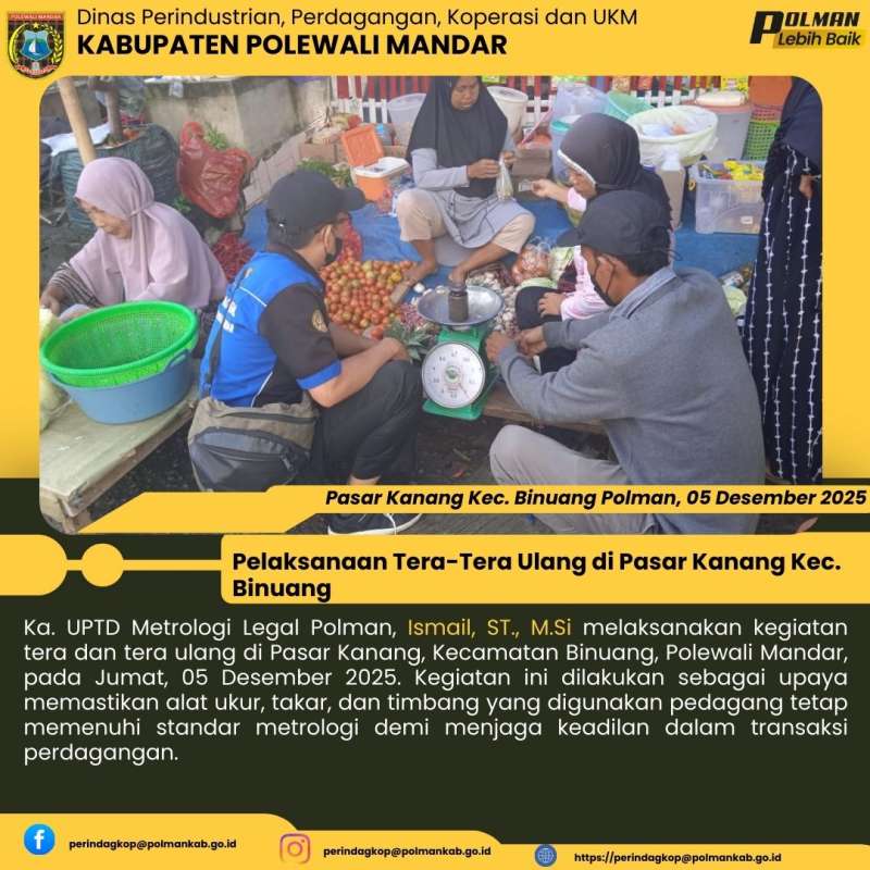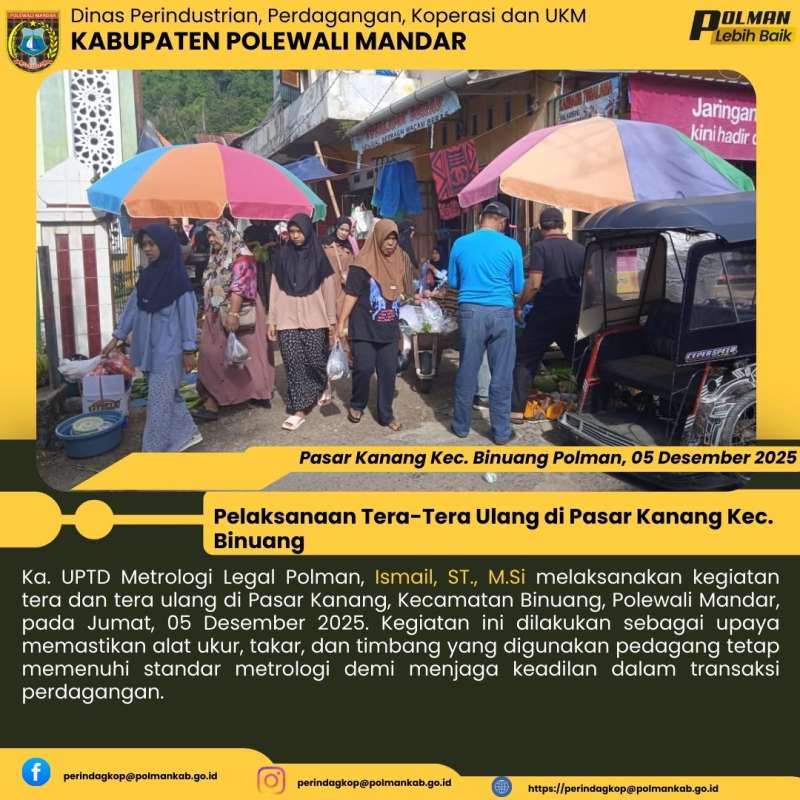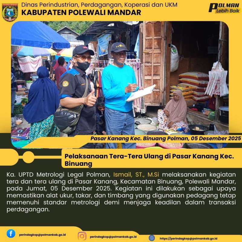 Ka. UPTD Metrologi Legal Polman, Ismail, ST., M.Si melaksanakan kegiatan tera dan tera ulang di Pasar Kanang, Kecamatan Binuang, Polewali Mandar, pada Jumat, 05 Desember 2025. Kegiatan ini dilakukan sebagai upaya memastikan alat ukur, takar, dan timbang yang digunakan pedagang tetap memenuhi standar metrologi demi menjaga keadilan dalam transaksi perdagangan.