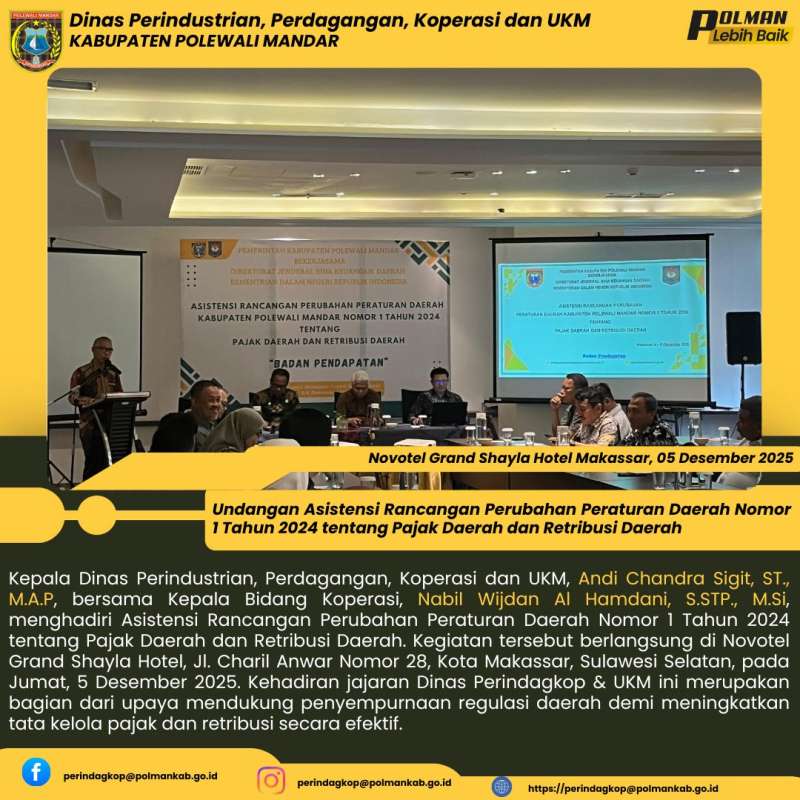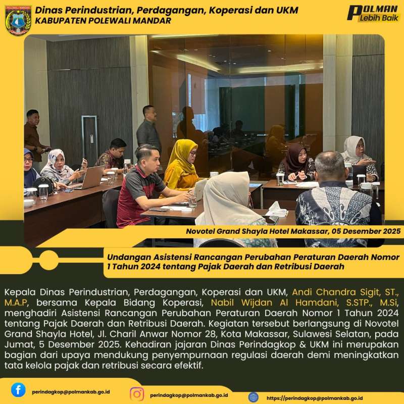 Kepala Dinas Perindustrian, Perdagangan, Koperasi dan UKM, Andi Chandra Sigit, ST., M.A.P, bersama Kepala Bidang Koperasi, Nabil Wijdan Al Hamdani, S.STP., M.Si, menghadiri Asistensi Rancangan Perubahan Peraturan Daerah Nomor 1 Tahun 2024 tentang Pajak Daerah dan Retribusi Daerah. Kegiatan tersebut berlangsung di Novotel Grand Shayla Hotel, Jl. Charil Anwar Nomor 28, Kota Makassar, Sulawesi Selatan, pada Jumat, 5 Desember 2025. Kehadiran jajaran Dinas Perindagkop & UKM ini merupakan bagian dari upaya mendukung penyempurnaan regulasi daerah demi meningkatkan tata kelola pajak dan retribusi secara efektif.
