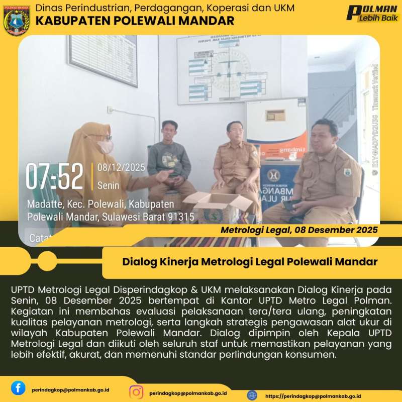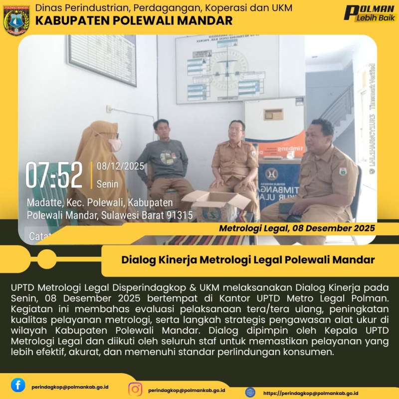 UPTD Metrologi Legal Disperindagkop & UKM melaksanakan Dialog Kinerja pada Senin, 08 Desember 2025 bertempat di Kantor UPTD Metro Legal Polman. Kegiatan ini membahas evaluasi pelaksanaan tera/tera ulang, peningkatan kualitas pelayanan metrologi, serta langkah strategis pengawasan alat ukur di wilayah Kabupaten Polewali Mandar. Dialog dipimpin oleh Kepala UPTD Metrologi Legal dan diikuti oleh seluruh staf untuk memastikan pelayanan yang lebih efektif, akurat, dan memenuhi standar perlindungan konsumen.
