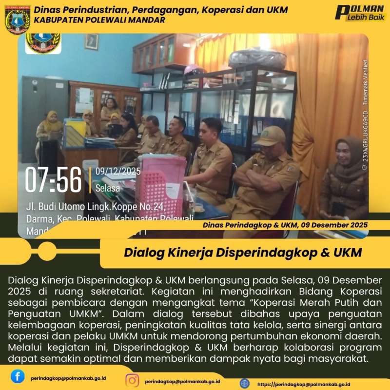 Kamis, 08 Januari 2026, Dinas Perindustrian, Perdagangan, Koperasi dan UKM menggelar Dialog Kinerja di ruang sekretariat Kegiatan ini mengangkat tema pembinaan koperasi serta percepatan penyediaan data UMKM sebagai upaya penguatan kelembagaan koperasi dan akurasi basis data UMKM guna mendukung perumusan kebijakan yang tepat sasaran....