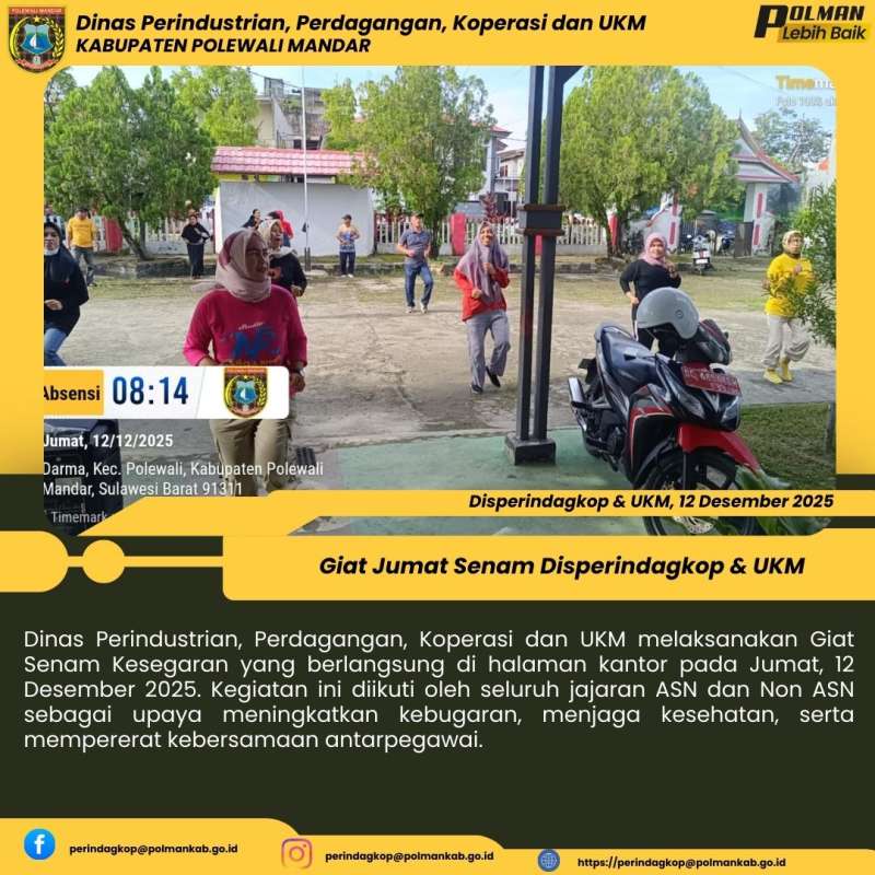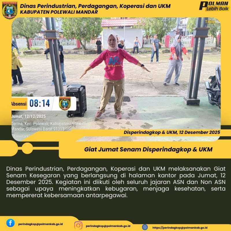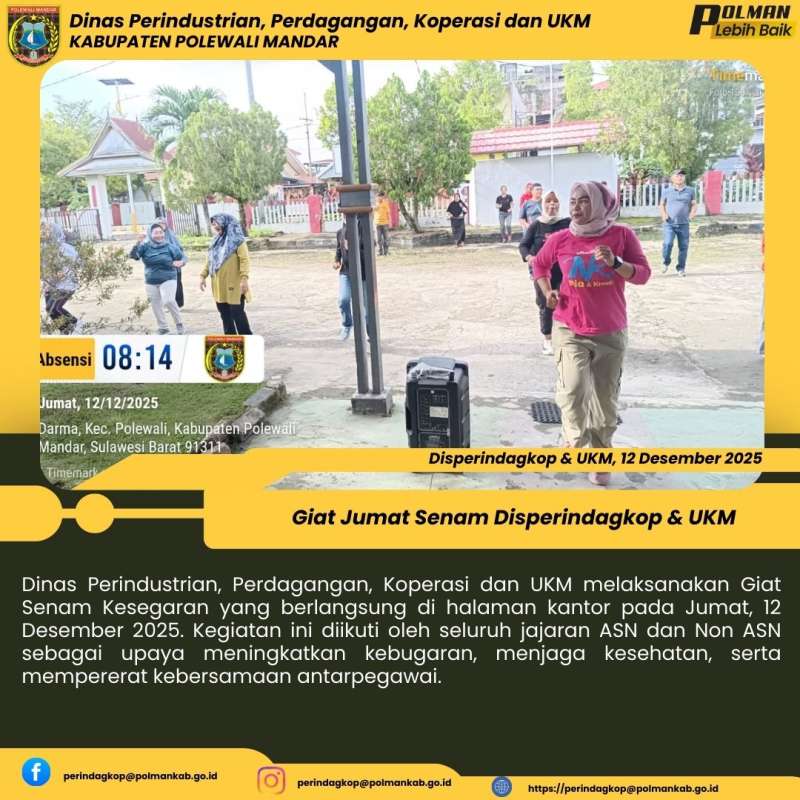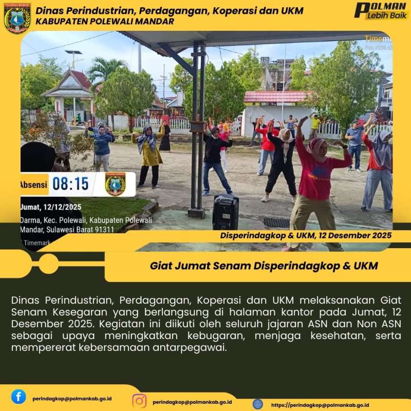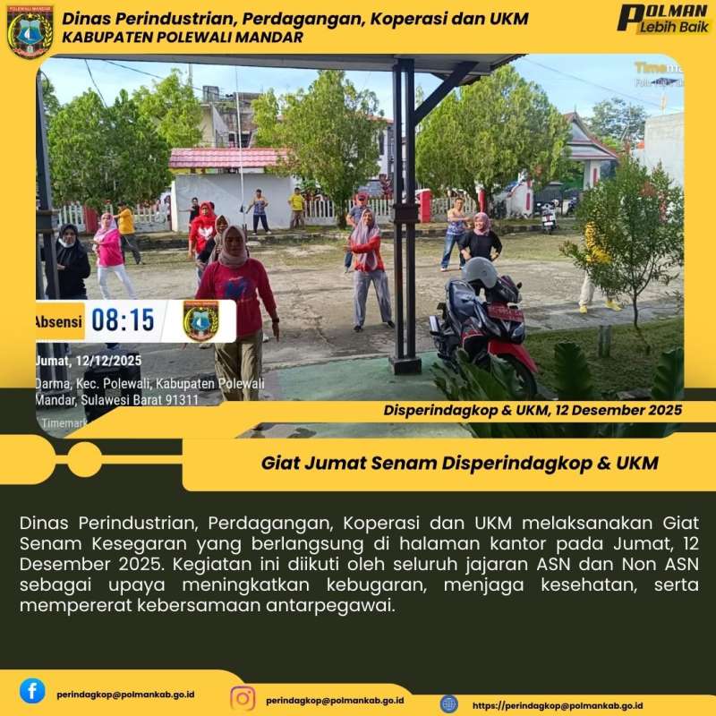 Dinas Perindustrian, Perdagangan, Koperasi dan UKM melaksanakan Giat Senam Kesegaran yang berlangsung di halaman kantor pada Jumat, 12 Desember 2025. Kegiatan ini diikuti oleh seluruh jajaran ASN dan Non ASN sebagai upaya meningkatkan kebugaran, menjaga kesehatan, serta mempererat kebersamaan antarpegawai.