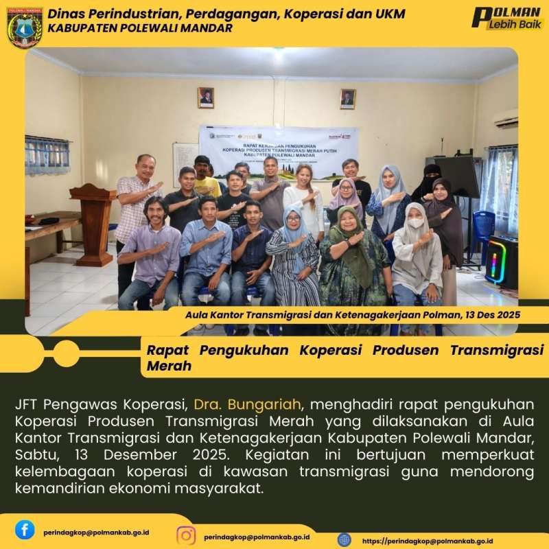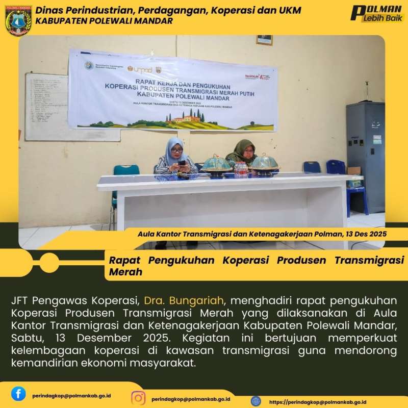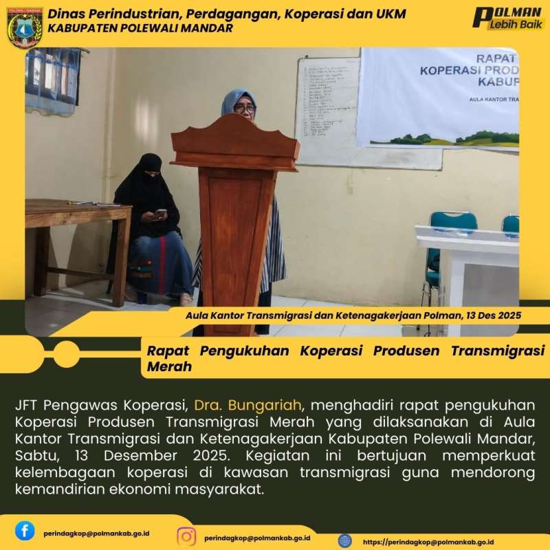 JFT Pengawas Koperasi, Dra. Bungariah, menghadiri rapat pengukuhan Koperasi Produsen Transmigrasi Merah yang dilaksanakan di Aula Kantor Transmigrasi dan Ketenagakerjaan Kabupaten Polewali Mandar, Sabtu, 13 Desember 2025. Kegiatan ini bertujuan memperkuat kelembagaan koperasi di kawasan transmigrasi guna mendorong kemandirian ekonomi masyarakat.