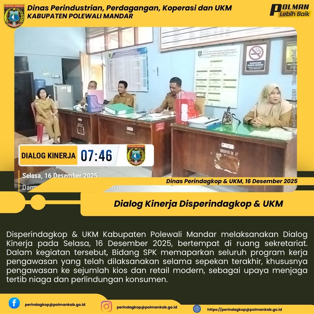 UPTD Sentra Pengolahan Industri Kecil Disperindagkop & UKM Kabupaten Polewali Mandar melaksanakan Dialog Kinerja pada Senin, 15 Desember 2025 di ruang sekretariat. Kegiatan ini membahas capaian kinerja, program kerja, serta evaluasi pelaksanaan kegiatan tahun 2025, disertai diskusi sebagai upaya peningkatan layanan dan pengembangan Industri Kecil di Kabupaten Polewali Mandar....