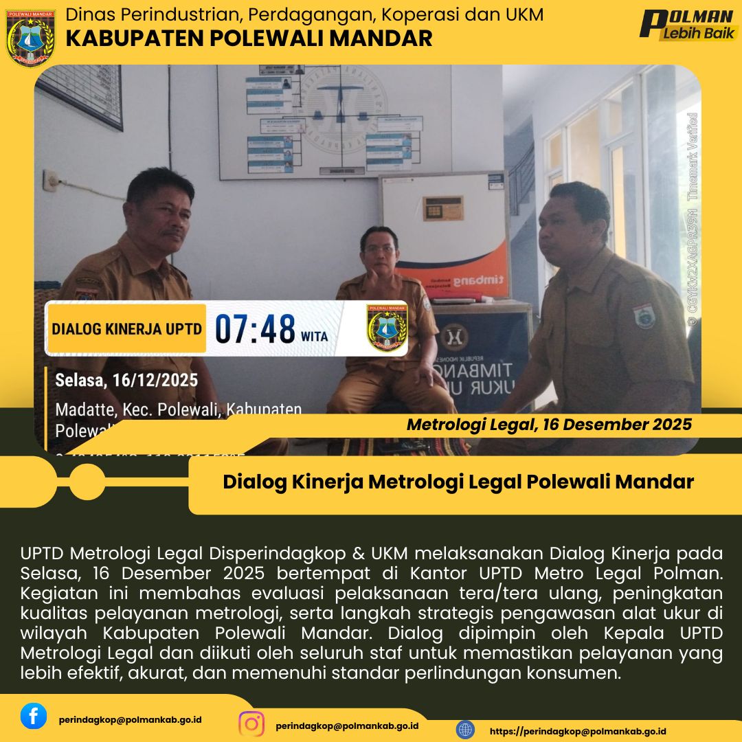 UPTD Metrologi Legal Disperindagkop & UKM melaksanakan Dialog Kinerja pada Selasa, 16 Desember 2025 bertempat di Kantor UPTD Metro Legal Polman. Kegiatan ini membahas evaluasi pelaksanaan tera/tera ulang, peningkatan kualitas pelayanan metrologi, serta langkah strategis pengawasan alat ukur di wilayah Kabupaten Polewali Mandar. Dialog dipimpin oleh Kepala UPTD Metrologi Legal dan diikuti oleh seluruh staf untuk memastikan pelayanan yang lebih efektif, akurat, dan memenuhi standar perlindungan konsumen....