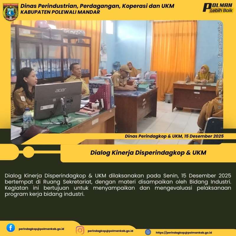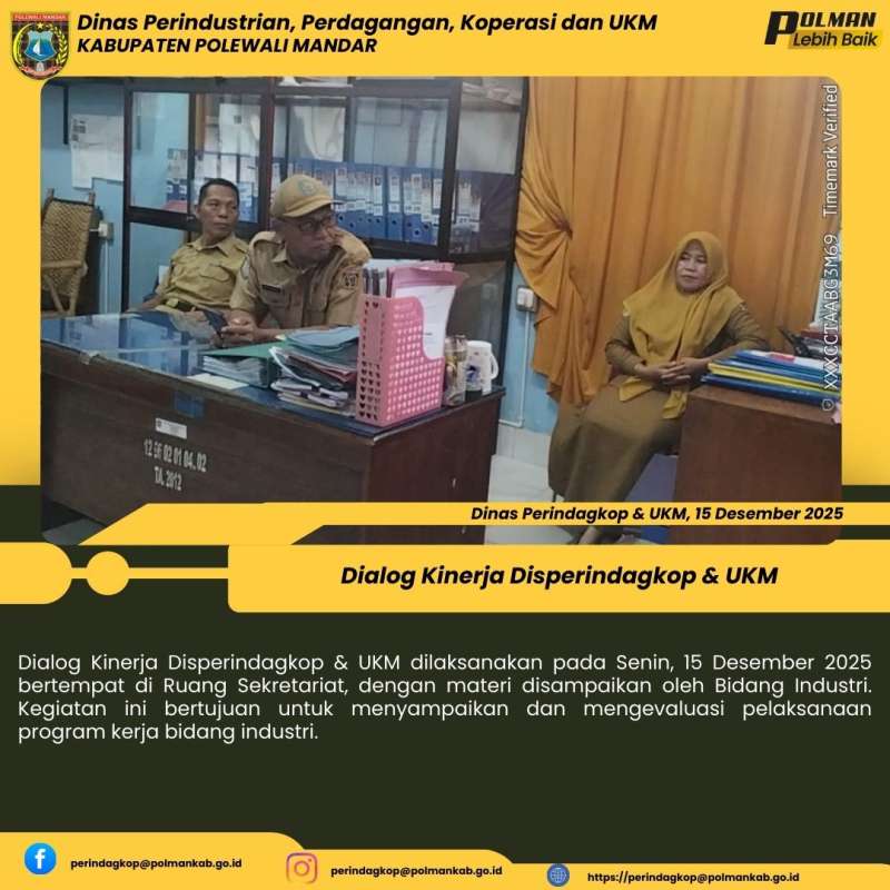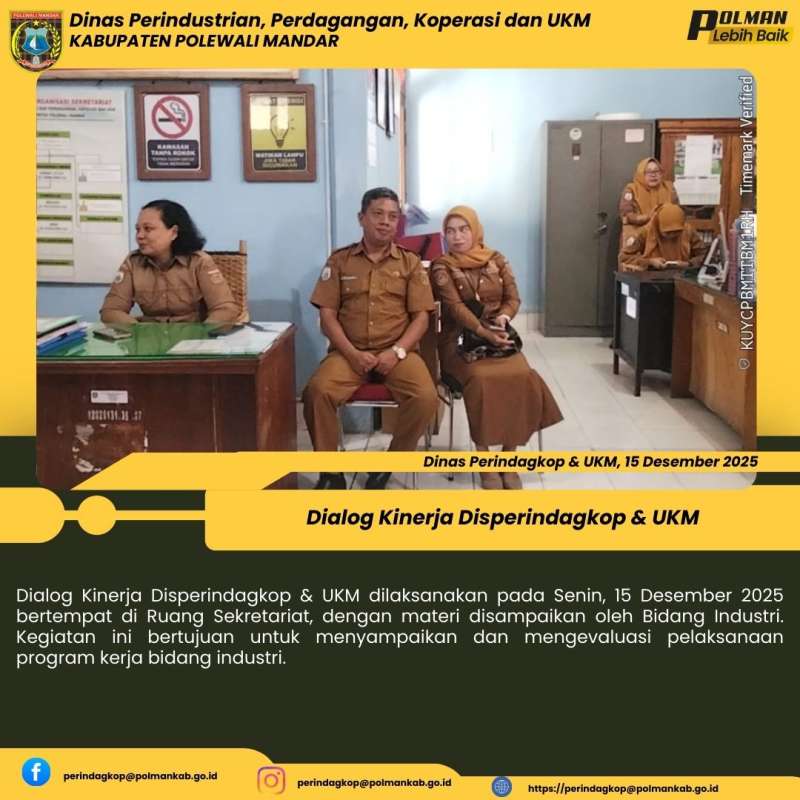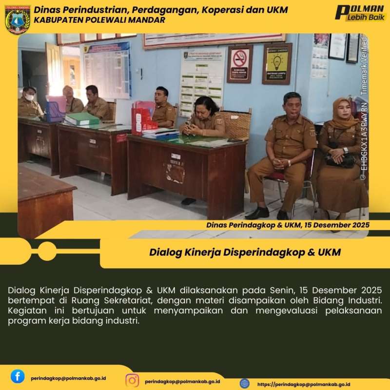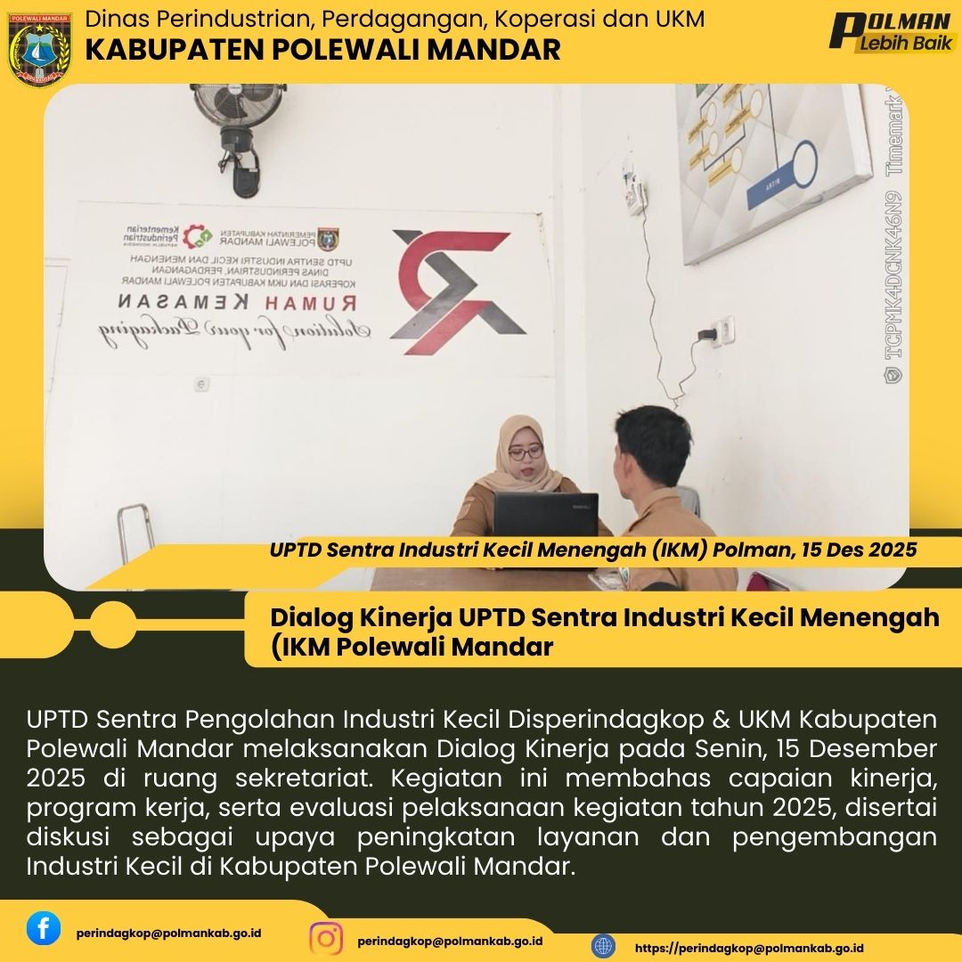 UPTD Sentra Pengolahan Industri Kecil Disperindagkop & UKM Kabupaten Polewali Mandar melaksanakan Dialog Kinerja pada Senin, 15 Desember 2025 di ruang sekretariat. Kegiatan ini membahas capaian kinerja, program kerja, serta evaluasi pelaksanaan kegiatan tahun 2025, disertai diskusi sebagai upaya peningkatan layanan dan pengembangan Industri Kecil di Kabupaten Polewali Mandar....