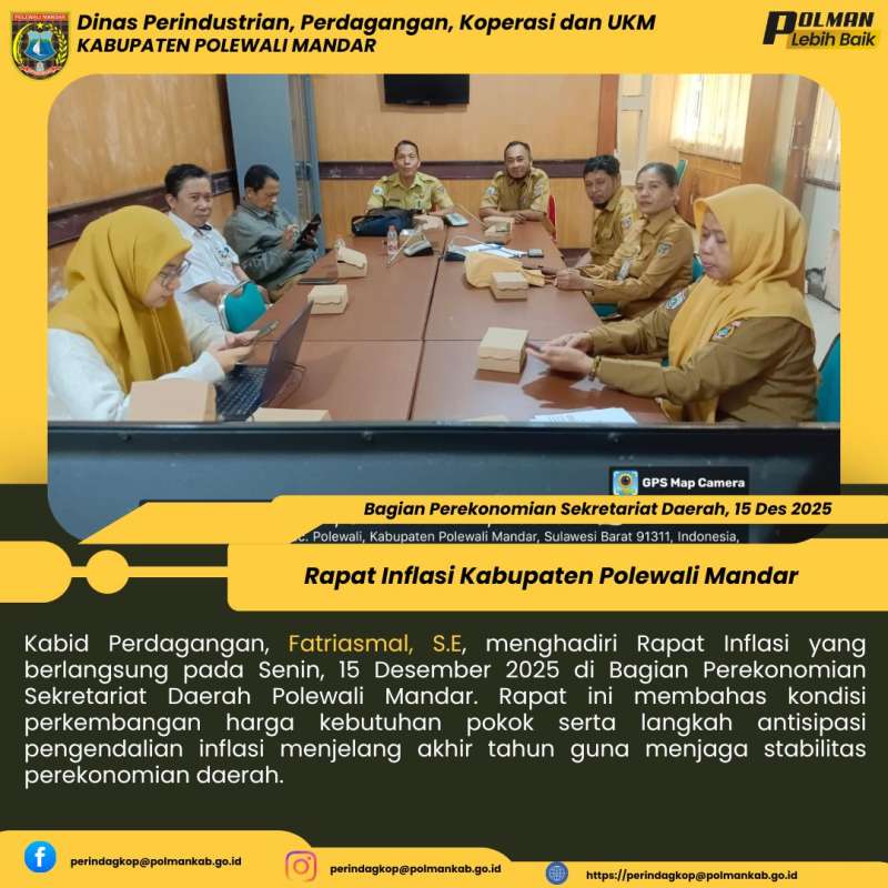 Kabid Perdagangan, Fatriasmal, S.E, menghadiri Rapat Inflasi yang berlangsung pada Senin, 15 Desember 2025 di Bagian Perekonomian Sekretariat Daerah Polewali Mandar. Rapat ini membahas kondisi perkembangan harga kebutuhan pokok serta langkah antisipasi pengendalian inflasi menjelang akhir tahun guna menjaga stabilitas perekonomian daerah....