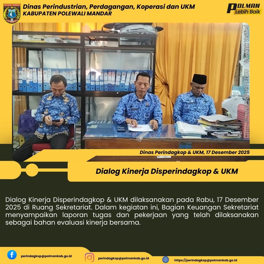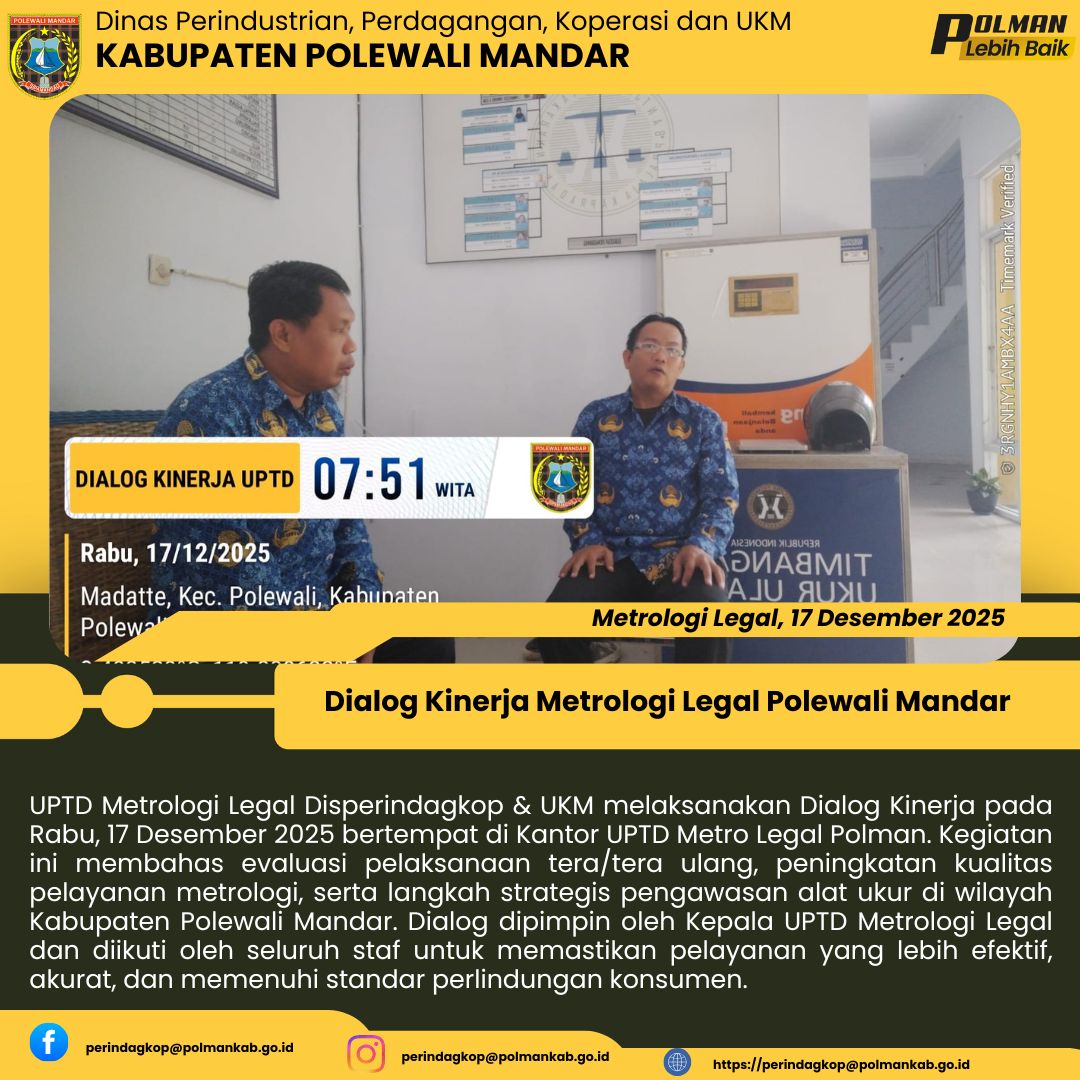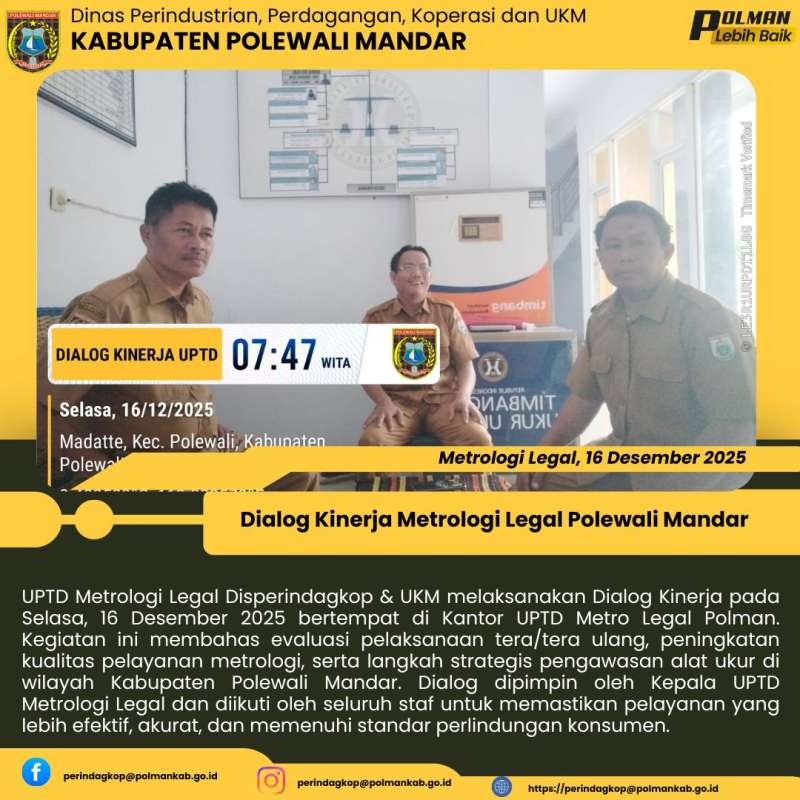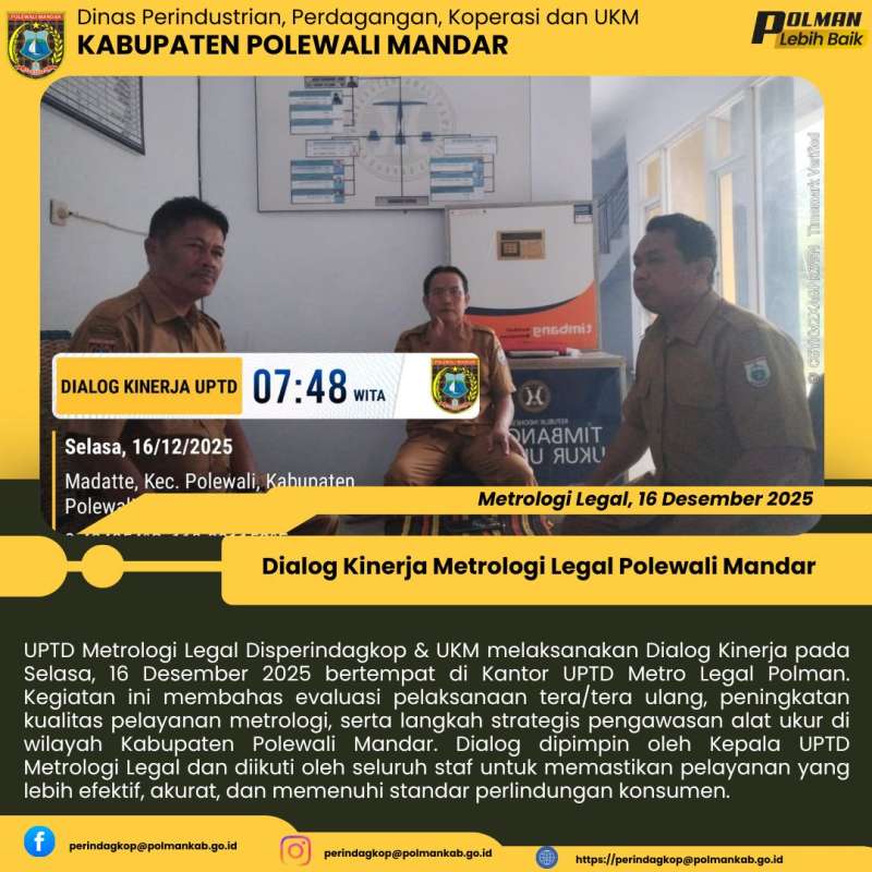 UPTD Metrologi Legal Disperindagkop & UKM melaksanakan Dialog Kinerja pada Selasa, 16 Desember 2025 bertempat di Kantor UPTD Metro Legal Polman. Kegiatan ini membahas evaluasi pelaksanaan tera/tera ulang, peningkatan kualitas pelayanan metrologi, serta langkah strategis pengawasan alat ukur di wilayah Kabupaten Polewali Mandar. Dialog dipimpin oleh Kepala UPTD Metrologi Legal dan diikuti oleh seluruh staf untuk memastikan pelayanan yang lebih efektif, akurat, dan memenuhi standar perlindungan konsumen.