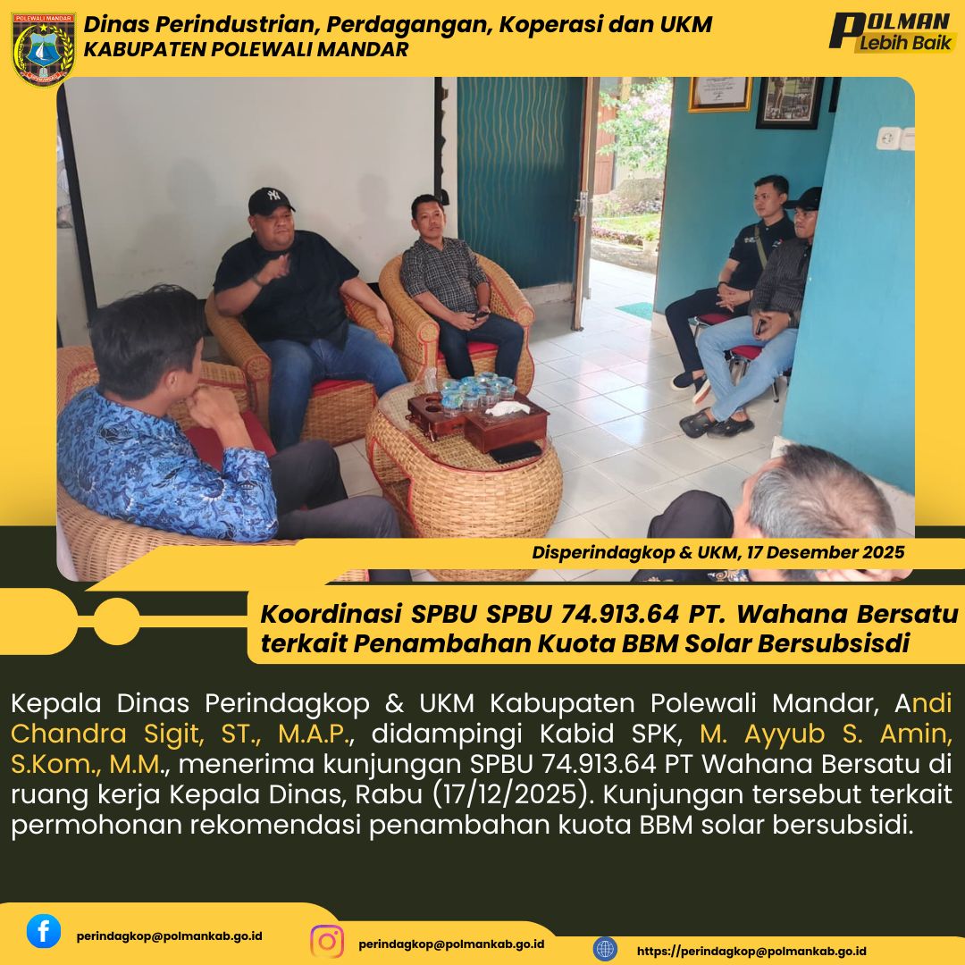 Kepala Dinas Perindagkop & UKM Kabupaten Polewali Mandar, Andi Chandra Sigit, ST., M.A.P., didampingi Kabid SPK, M. Ayyub S. Amin, S.Kom., M.M., menerima kunjungan SPBU 74.913.64 PT Wahana Bersatu di ruang kerja Kepala Dinas, Rabu (17/12/2025). Kunjungan tersebut terkait permohonan rekomendasi penambahan kuota BBM solar bersubsidi....